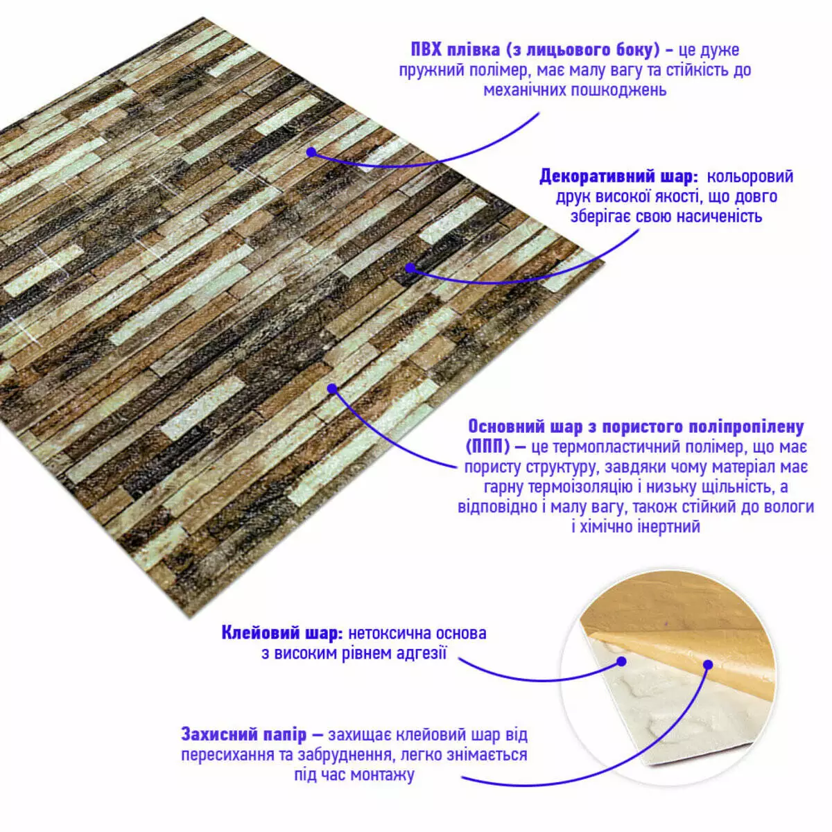 - Захисний папір – оберігає клейовий шар від пересихання та забруднення, легко знімається під час монтажу.