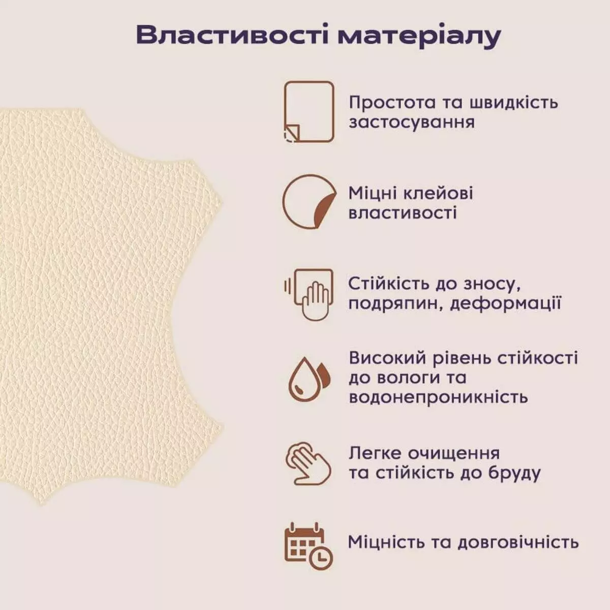 - Головна властивість самоклейної екошкіри – здатність легко, швидко та щільно приклеюватися до інших поверхонь без застосування сторонніх спеціалістів, інших адгезивних матеріалів та спеціальних інструментів. Це робить її найзручнішим матеріалом для бюджетної реставрації товарів із натуральної шкіри чи її аналогів;