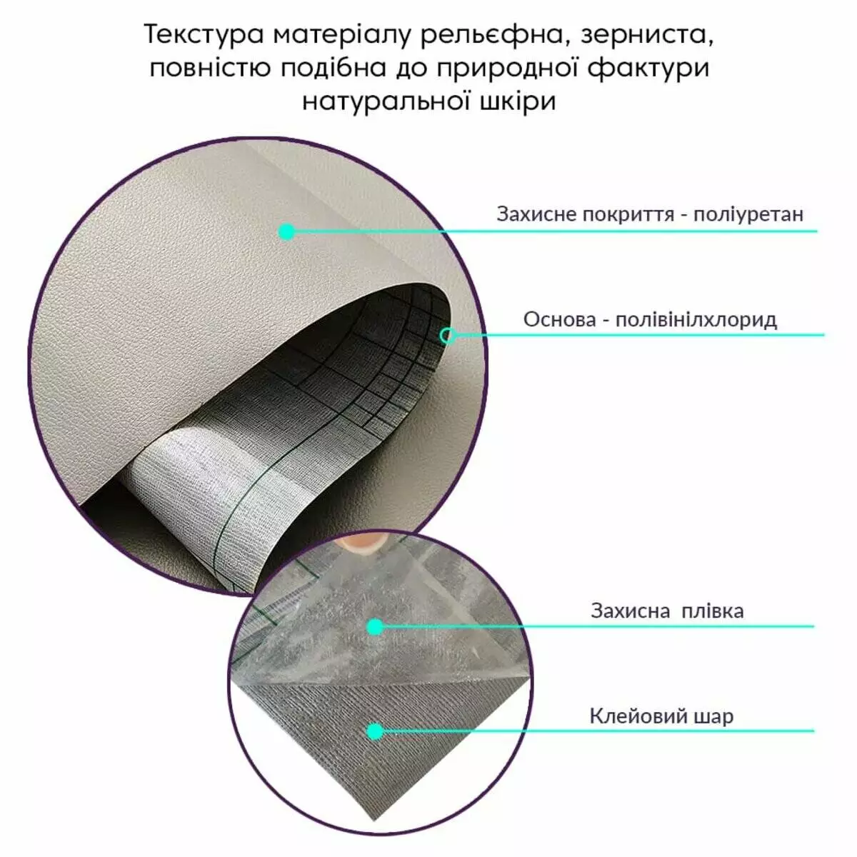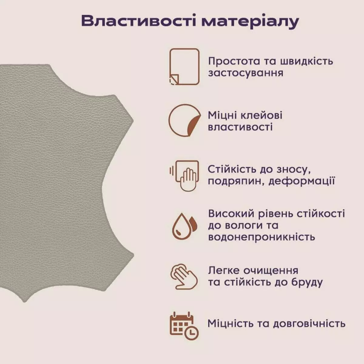 - Екологічна перевага: самоклейна екошкіра виготовляється без використання тваринного шкіряного матеріалу, тому вона є більш екологічною альтернативою натуральній шкірі.