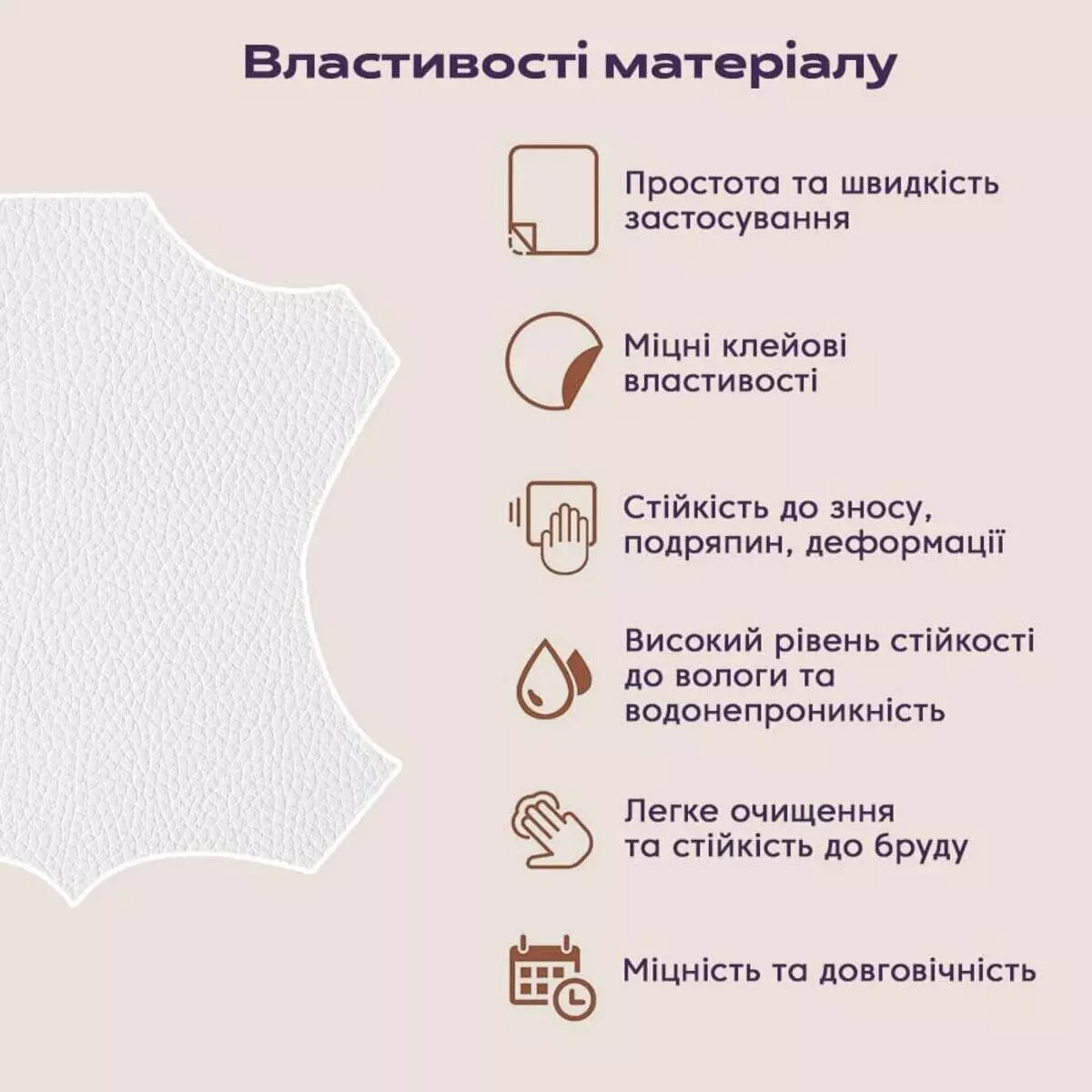 - Екологічна перевага: самоклейна екошкіра виготовляється без використання тваринного шкіряного матеріалу, тому вона є більш екологічною альтернативою натуральній шкірі.