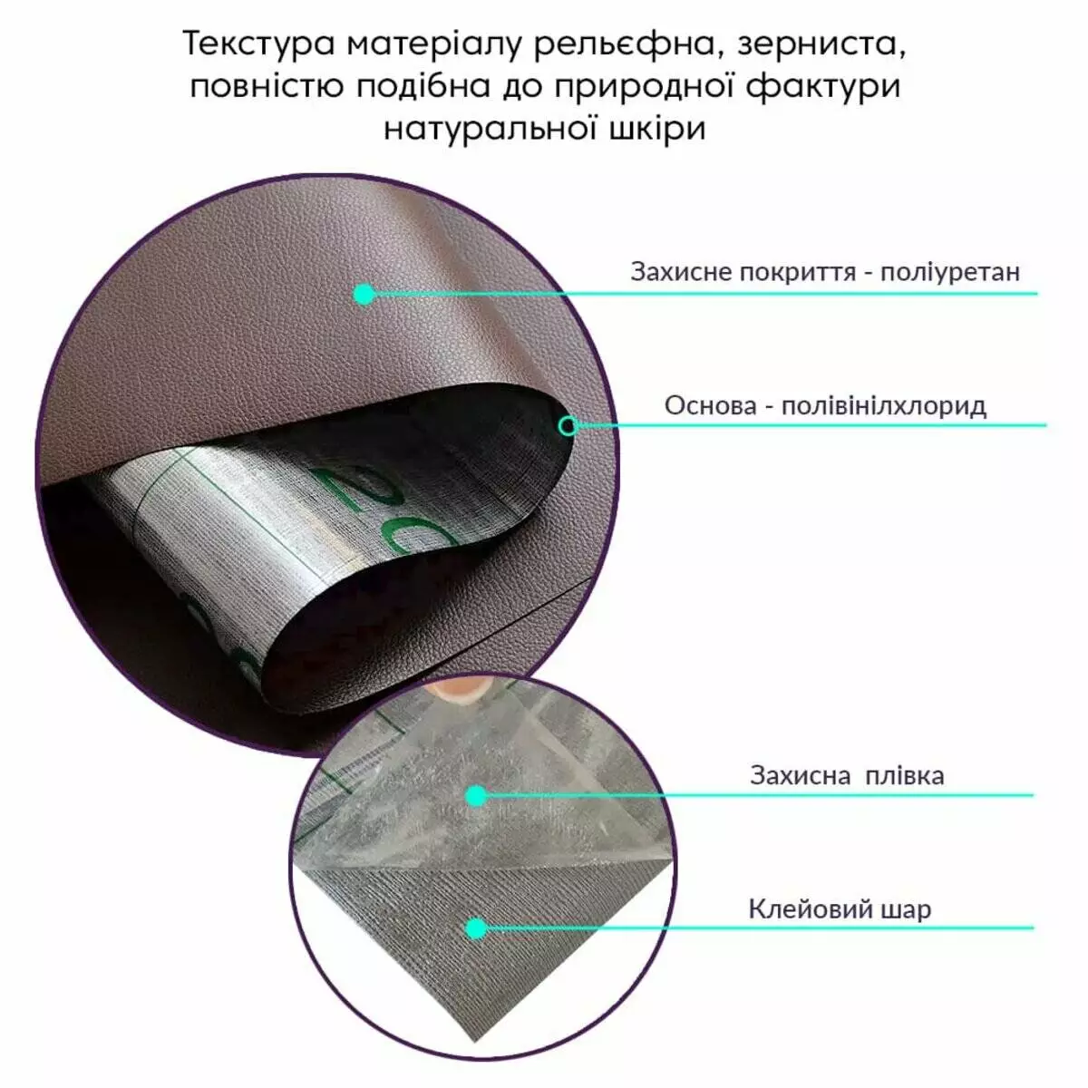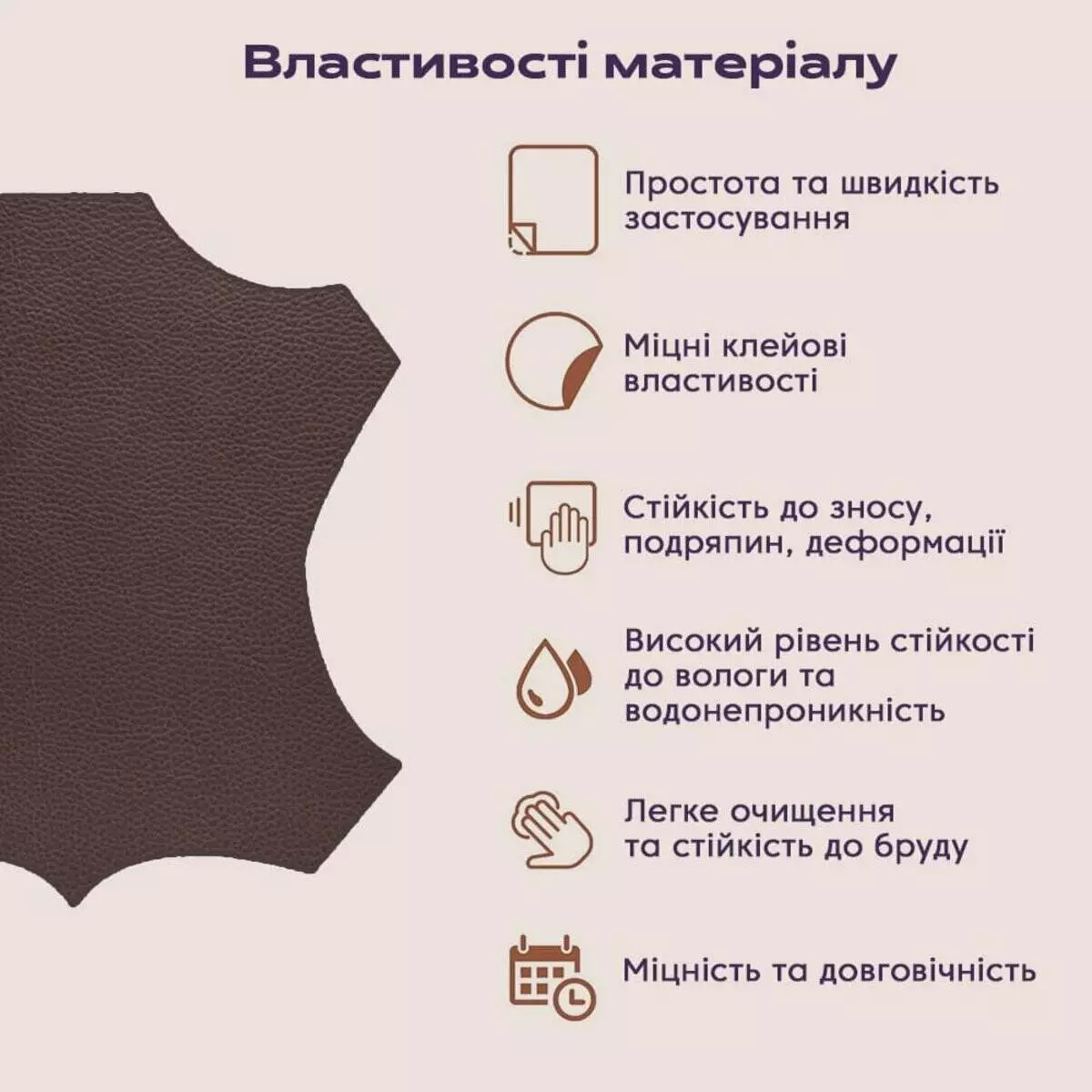 - Екологічна перевага: самоклейна екошкіра виготовляється без використання тваринного шкіряного матеріалу, тому вона є більш екологічною альтернативою натуральній шкірі.