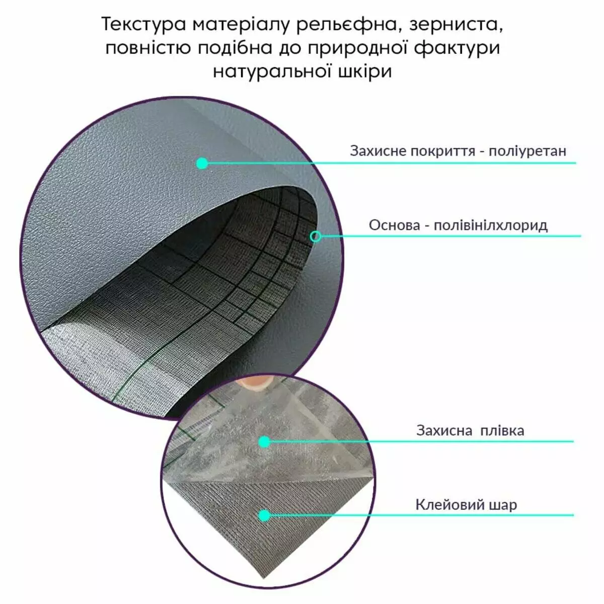 - Екологічна перевага: самоклейна екошкіра виготовляється без використання тваринного шкіряного матеріалу, тому вона є більш екологічною альтернативою натуральній шкірі.