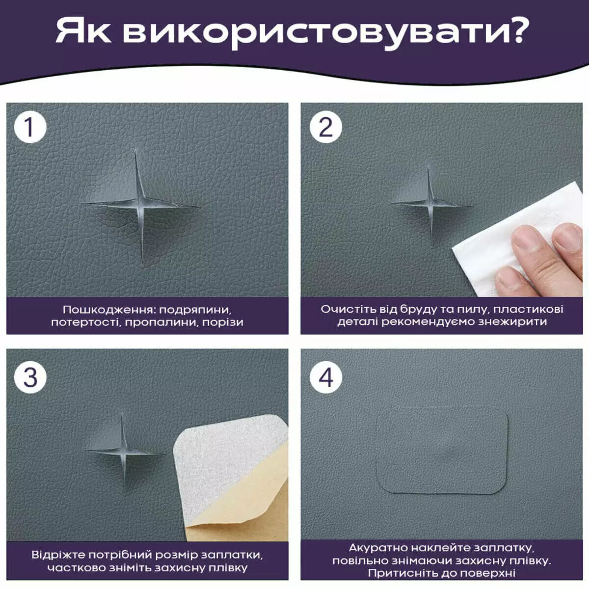 - Матеріал представлений смугами досить великої довжини: 1 м та 3 м, що збільшує варіативність розміру площі використання: від малих, фігурних латок до усунення дефектів великих шкіряних поверхонь;