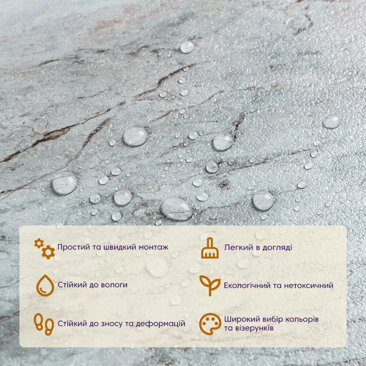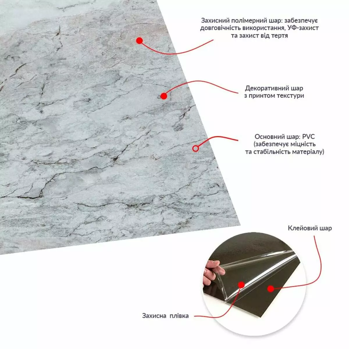 - Декоративний шар: плівка із кольоровим друком, який повністю передає фактуру природних матеріалів: деревини, каменю та інших