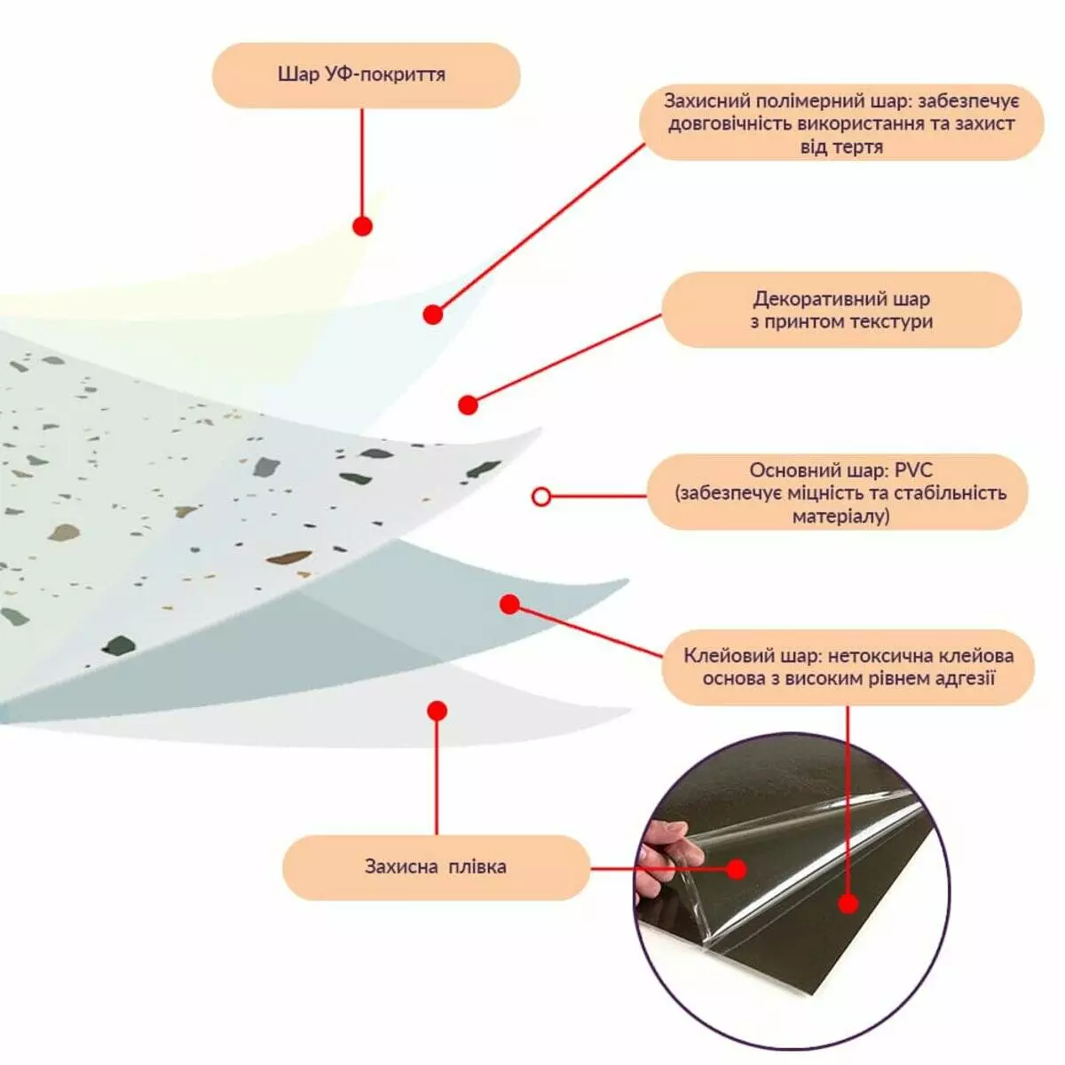 - Декоративний шар: плівка із кольоровим друком, який повністю передає фактуру природних матеріалів: деревини, каменю та інших