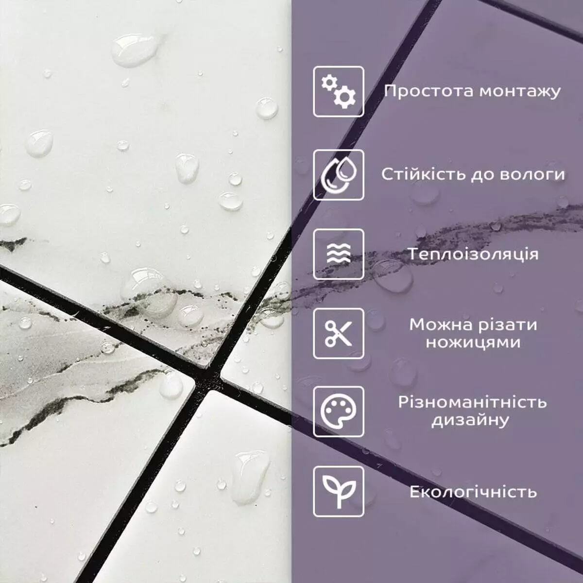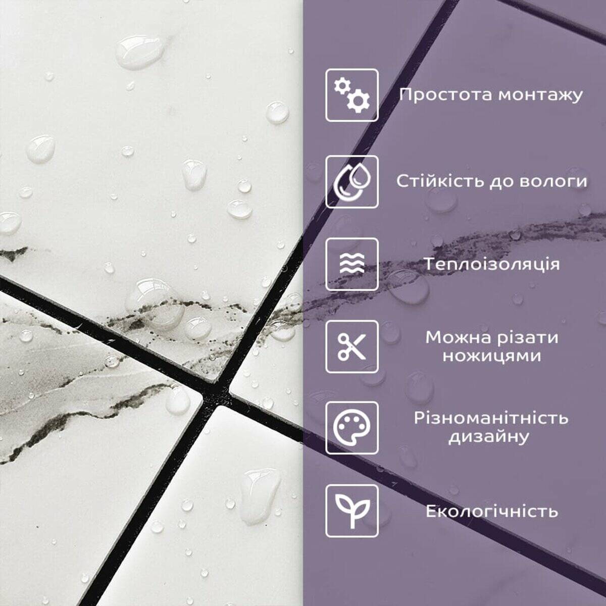 - Стійкість до вологи: матеріал стійкий до впливу вологи та пари, а також до появи плісняви, що робить його придатним для використання у приміщеннях з високою вологістю, таких як ванни та кухні. Плитка підходить для створення фартуха кухні, можна клеїти біля плити на відстані не менше ніж 20-25 см;