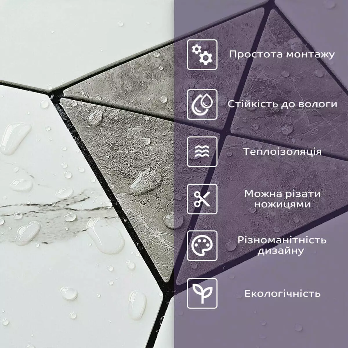 - Легкість та міцність: плитка легка та міцна, що спрощує її логістику, установку та забезпечує довгий термін служби. Матеріал легкий в установці, можна різати ножицями чи монтажним ножем, не потребує додаткових матеріалів чи спеціалістів. Між смугами не розходиться, не роздмухується і не деформується. Відсоток обрізу становить 1%, що є найкращим показником для настінних покриттів;