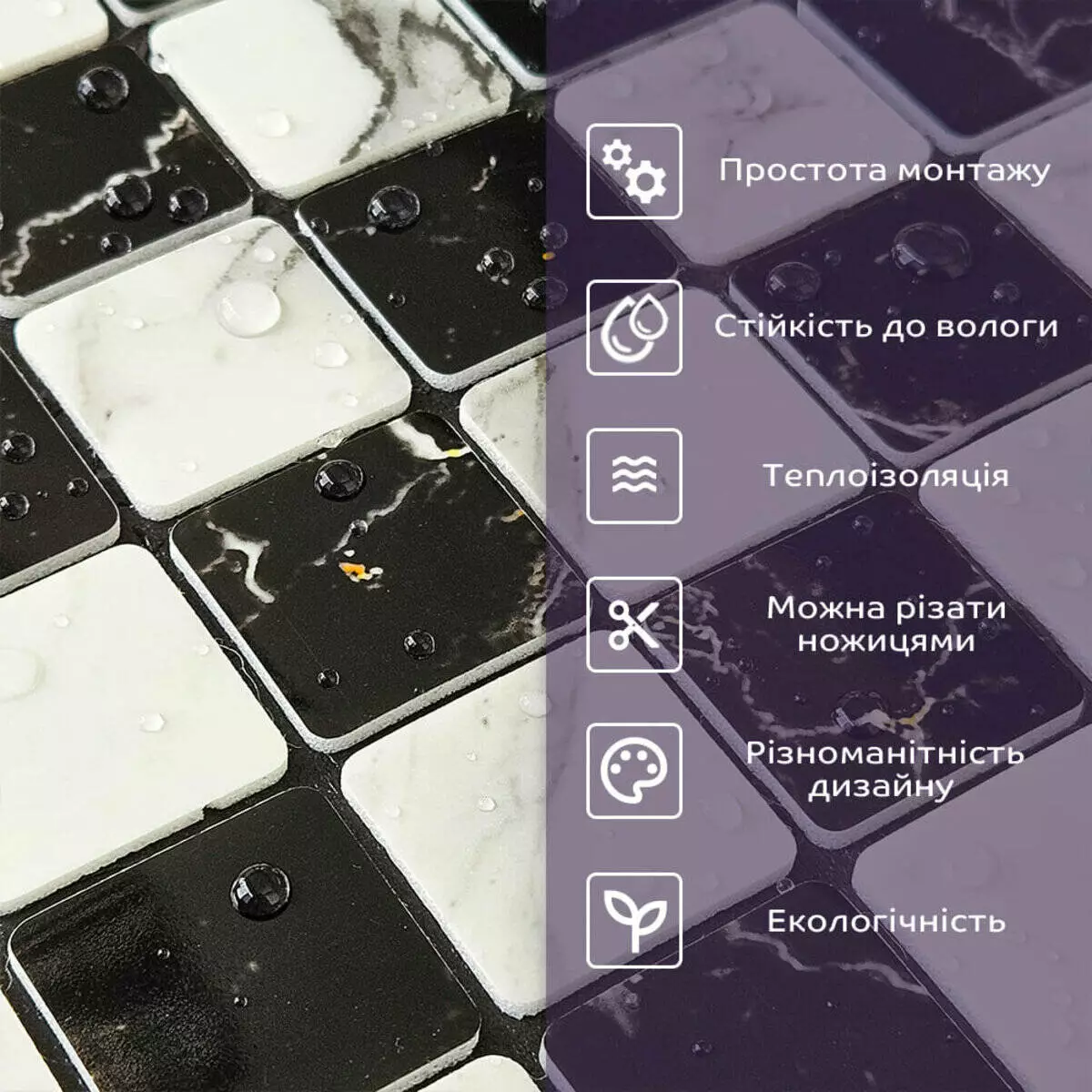 - Стійкість до вологи: матеріал стійкий до впливу вологи та пари, а також до появи плісняви, що робить його придатним для використання у приміщеннях з високою вологістю, таких як ванни та кухні. Плитка підходить для створення фартуха кухні, можна клеїти біля плити на відстані не менше ніж 20-25 см;