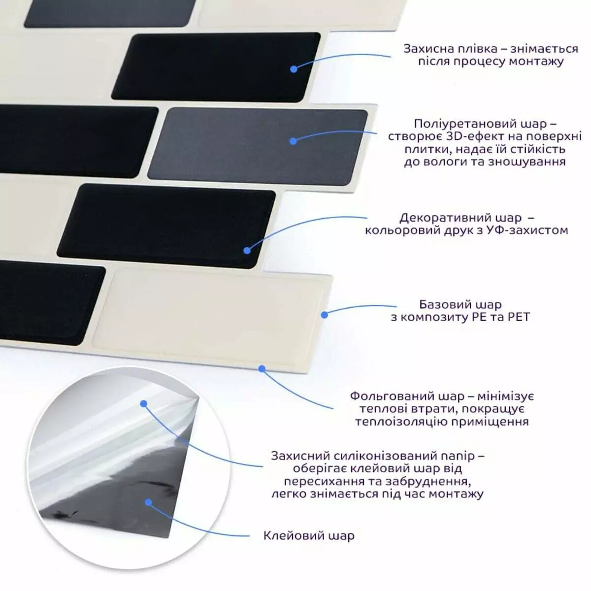 • Захисний силіконізований папір: зберігає клейовий шар від пересихання та забруднення, легко знімається під час монтажу.