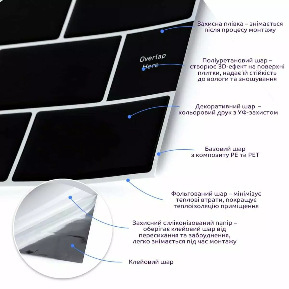 • Захисна плівка: зберігає поліуретанову поверхню від подряпин, відколів та інших механічних пошкоджень у процесі транспортування. Після проведення монтажу плівка знімається з поверхні плитки.