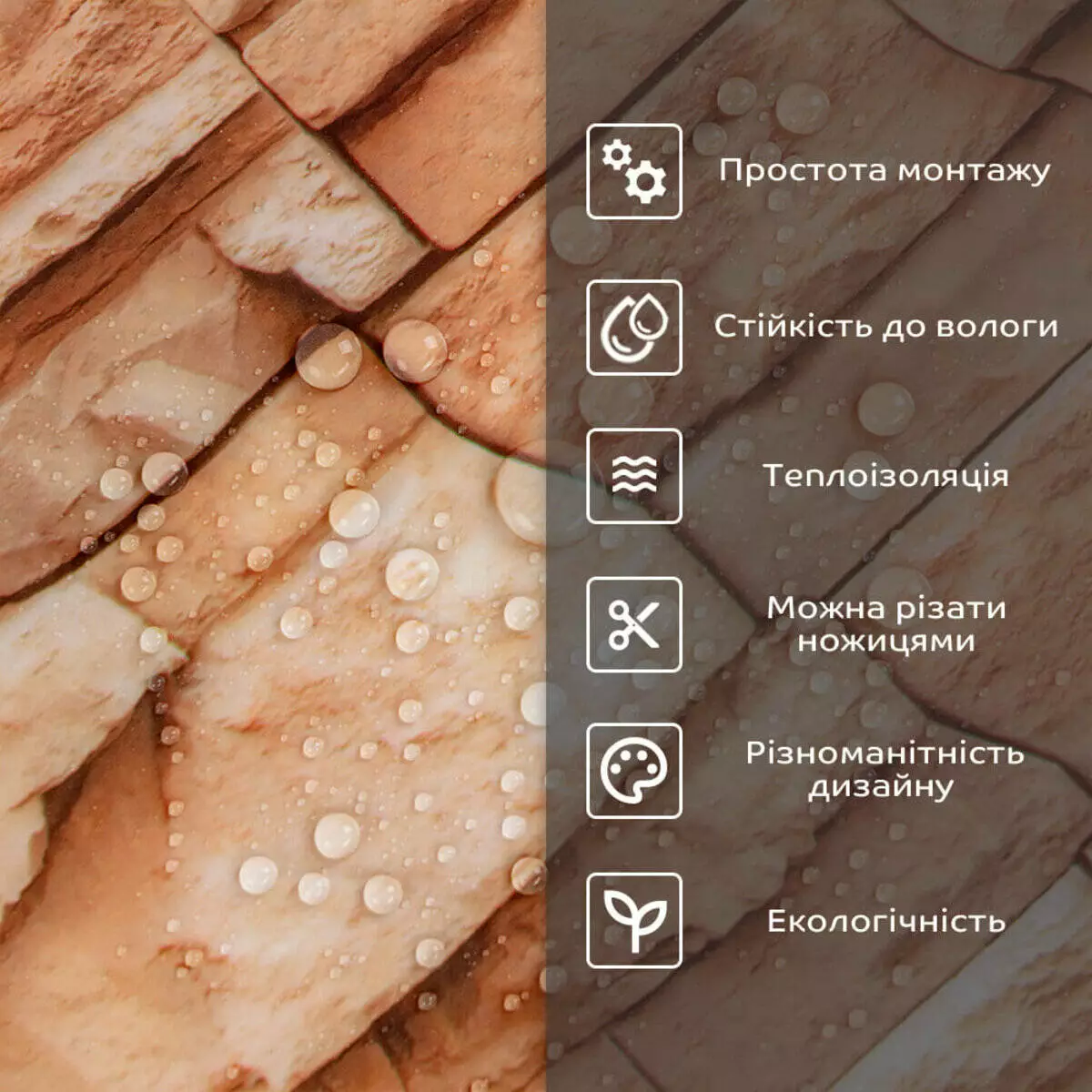 - 1. Легкість та міцність: плитка легка та міцна, що спрощує її логістику, установку та забезпечує довгий термін служби. Матеріал легкий в установці, можна різати ножицями чи монтажним ножем, не потребує додаткових матеріалів чи спеціалістів. Між смугами не розходиться, не роздмухується і не деформується. Відсоток обрізу становить 1%, що є найкращим показником для настінних покриттів;