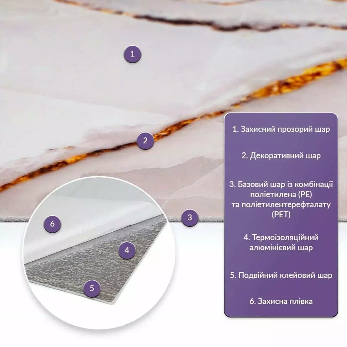 Як і в натуральних матеріалах, малюнки РЕТ плиток можуть трохи відрізнятися між собою, зберігаючи при цьому загальний дизайн та колір, що ще більше підкреслює природну імітацію. Також просимо взяти до уваги, що виробник має право змінювати зовнішній вигляд товару, зокрема відтінок та малюнок, на власний розсуд і без попереднього повідомлення.Шари матеріалу: