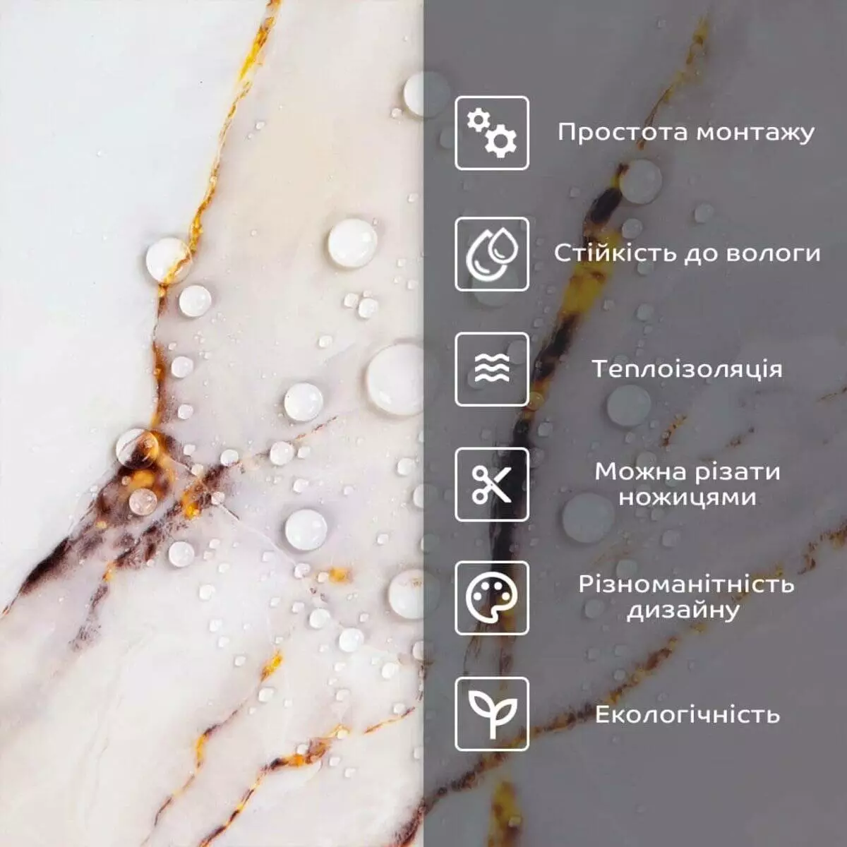 - 1. Легкість та міцність: плитка легка та міцна, що спрощує її логістику, установку та забезпечує довгий термін служби. Матеріал легкий в установці, можна різати ножицями чи монтажним ножем, не потребує додаткових матеріалів чи спеціалістів. Між смугами не розходиться, не роздмухується і не деформується. Відсоток обрізу становить 1%, що є найкращим показником для настінних покриттів;