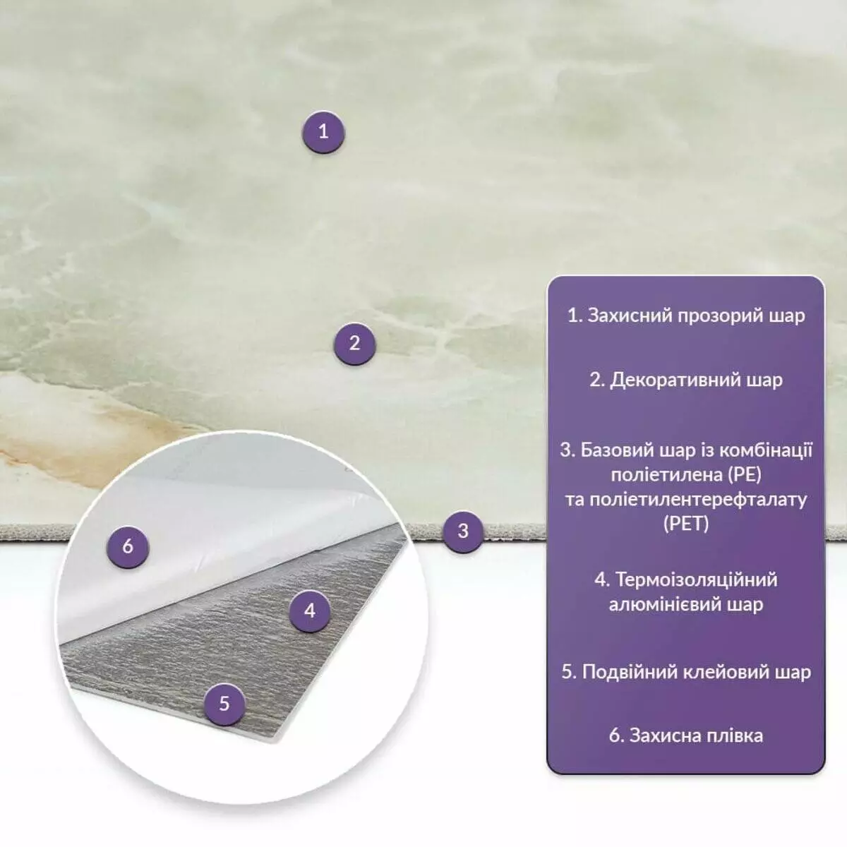 Як і в натуральних матеріалах, малюнки РЕТ плиток можуть трохи відрізнятися між собою, зберігаючи при цьому загальний дизайн та колір, що ще більше підкреслює природну імітацію. Також просимо взяти до уваги, що виробник має право змінювати зовнішній вигляд товару, зокрема відтінок та малюнок, на власний розсуд і без попереднього повідомлення.Шари матеріалу: