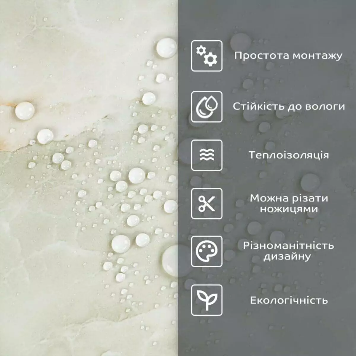 - 1. Легкість та міцність: плитка легка та міцна, що спрощує її логістику, установку та забезпечує довгий термін служби. Матеріал легкий в установці, можна різати ножицями чи монтажним ножем, не потребує додаткових матеріалів чи спеціалістів. Між смугами не розходиться, не роздмухується і не деформується. Відсоток обрізу становить 1%, що є найкращим показником для настінних покриттів;