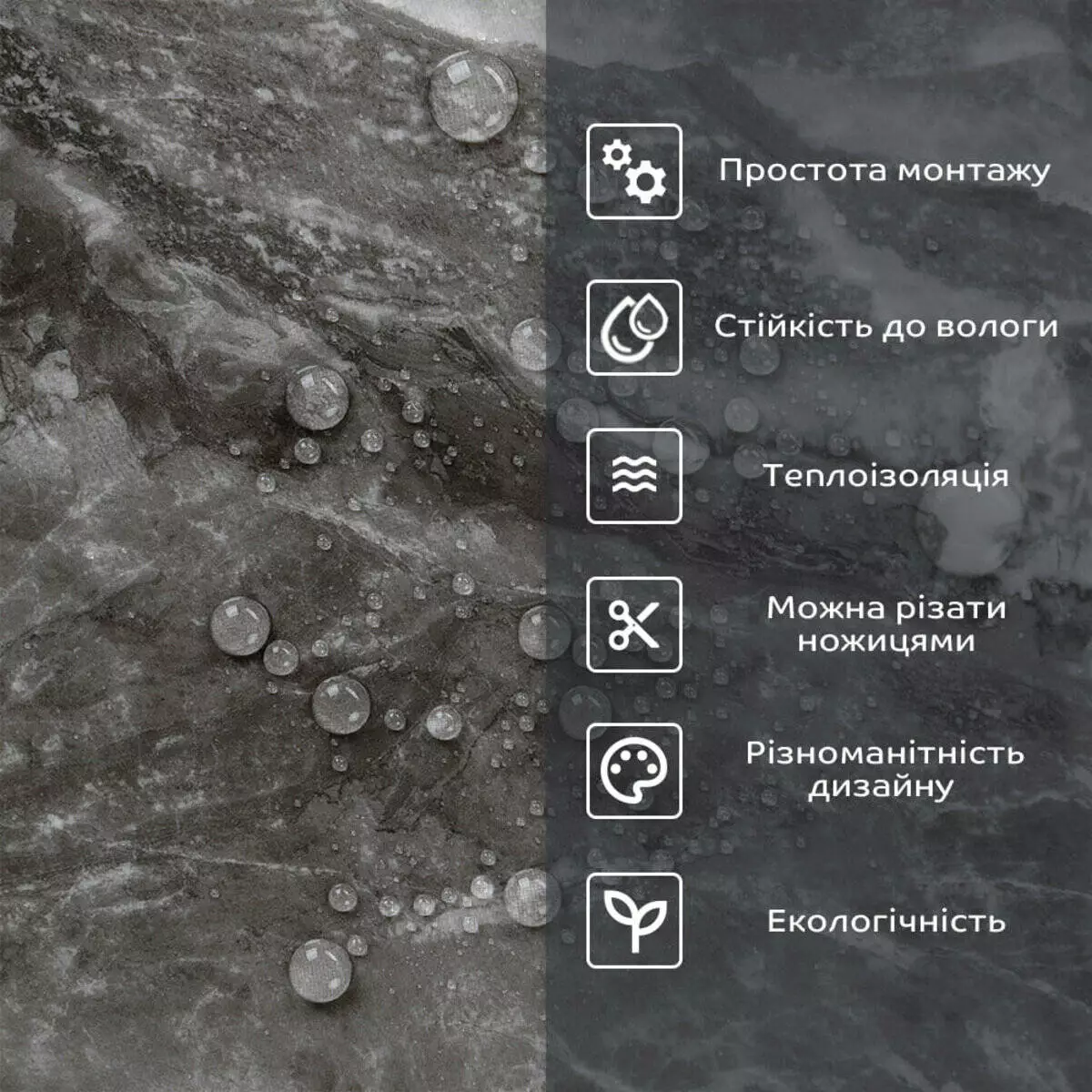 - 1. Легкість та міцність: плитка легка та міцна, що спрощує її логістику, установку та забезпечує довгий термін служби. Матеріал легкий в установці, можна різати ножицями чи монтажним ножем, не потребує додаткових матеріалів чи спеціалістів. Між смугами не розходиться, не роздмухується і не деформується. Відсоток обрізу становить 1%, що є найкращим показником для настінних покриттів;