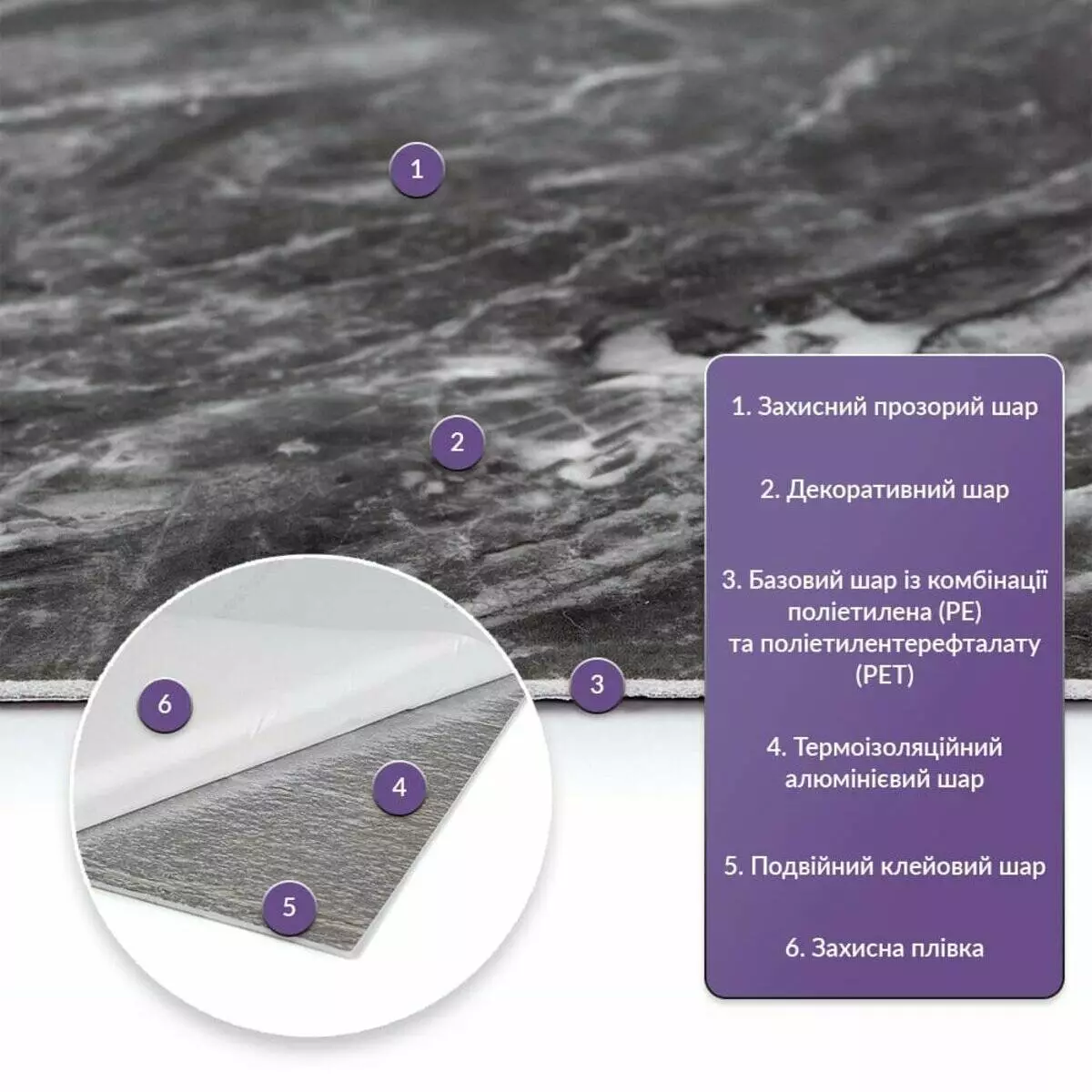Як і в натуральних матеріалах, малюнки РЕТ плиток можуть трохи відрізнятися між собою, зберігаючи при цьому загальний дизайн та колір, що ще більше підкреслює природну імітацію. Також просимо взяти до уваги, що виробник має право змінювати зовнішній вигляд товару, зокрема відтінок та малюнок, на власний розсуд і без попереднього повідомлення.Шари матеріалу: