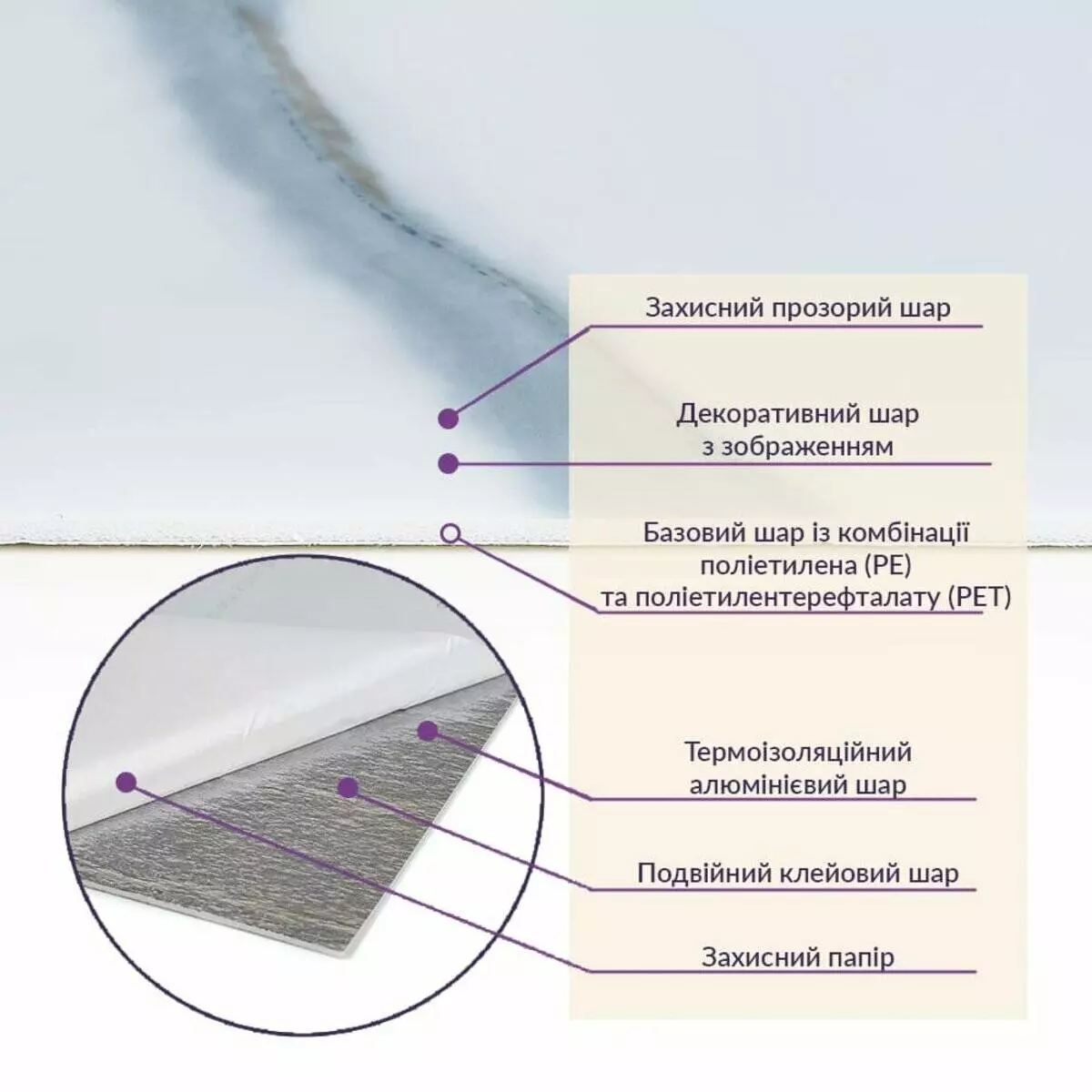 - 3. Ізоляція: плитка має звукову та теплоізоляцію завдяки наявності повітряних прошарків та додатковому алюмінієвому шару;