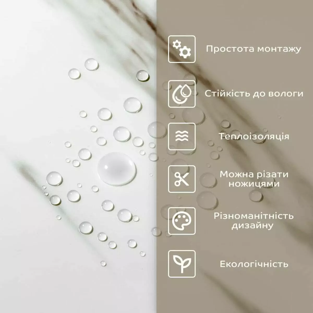 - 1. Легкість та міцність: плитка легка та міцна, що спрощує її логістику, установку та забезпечує довгий термін служби. Матеріал легкий в установці, можна різати ножицями чи монтажним ножем, не потребує додаткових матеріалів чи спеціалістів. Між смугами не розходиться, не роздмухується і не деформується. Відсоток обрізу становить 1%, що є найкращим показником для настінних покриттів;