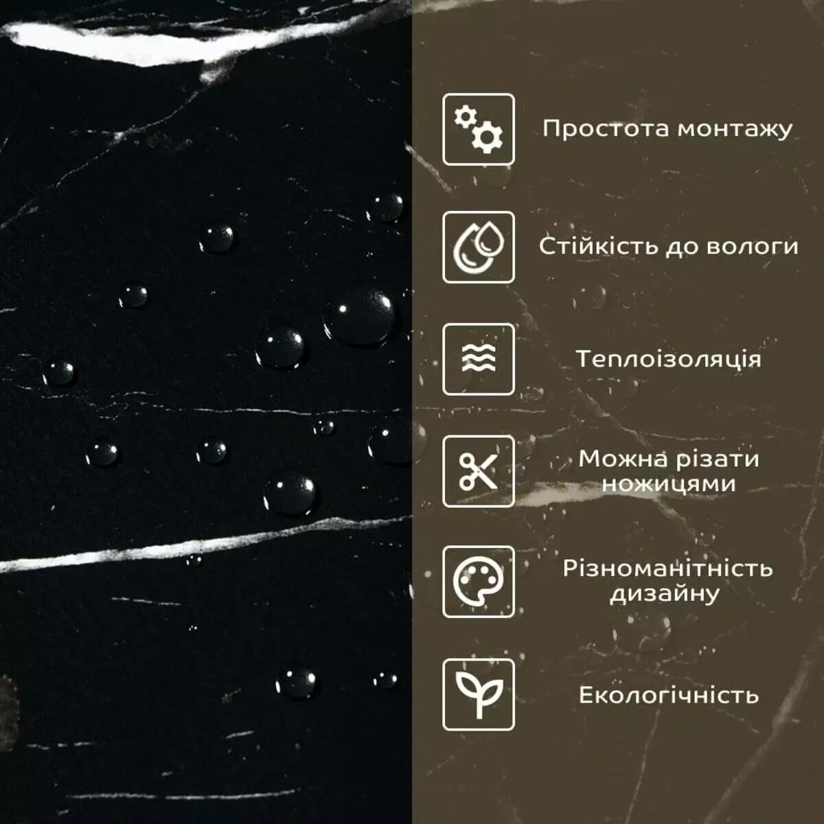 - 1. Легкість та міцність: плитка легка та міцна, що спрощує її логістику, установку та забезпечує довгий термін служби. Матеріал легкий в установці, можна різати ножицями чи монтажним ножем, не потребує додаткових матеріалів чи спеціалістів. Між смугами не розходиться, не роздмухується і не деформується. Відсоток обрізу становить 1%, що є найкращим показником для настінних покриттів;
