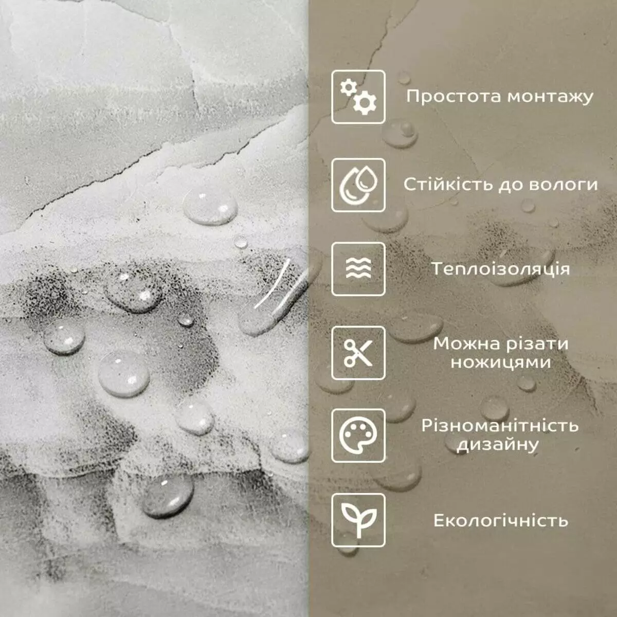 - 1. Легкість та міцність: плитка легка та міцна, що спрощує її логістику, установку та забезпечує довгий термін служби. Матеріал легкий в установці, можна різати ножицями чи монтажним ножем, не потребує додаткових матеріалів чи спеціалістів. Між смугами не розходиться, не роздмухується і не деформується. Відсоток обрізу становить 1%, що є найкращим показником для настінних покриттів;