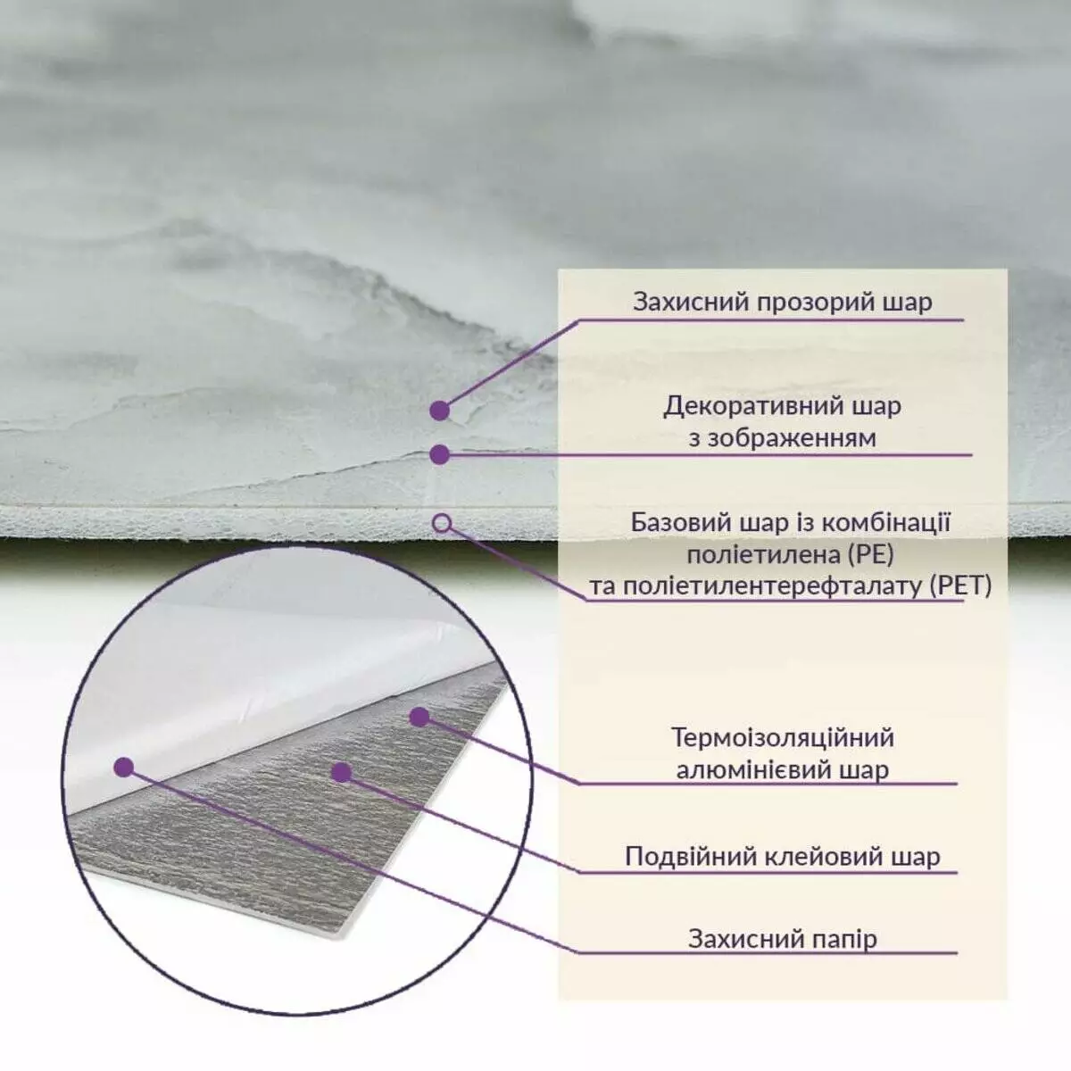 Як і в натуральних матеріалах, малюнки РЕТ плиток можуть трохи відрізнятися між собою, зберігаючи при цьому загальний дизайн та колір, що ще більше підкреслює природну імітацію. Також просимо взяти до уваги, що виробник має право змінювати зовнішній вигляд товару, зокрема відтінок та малюнок, на власний розсуд і без попереднього повідомлення.Шари матеріалу: