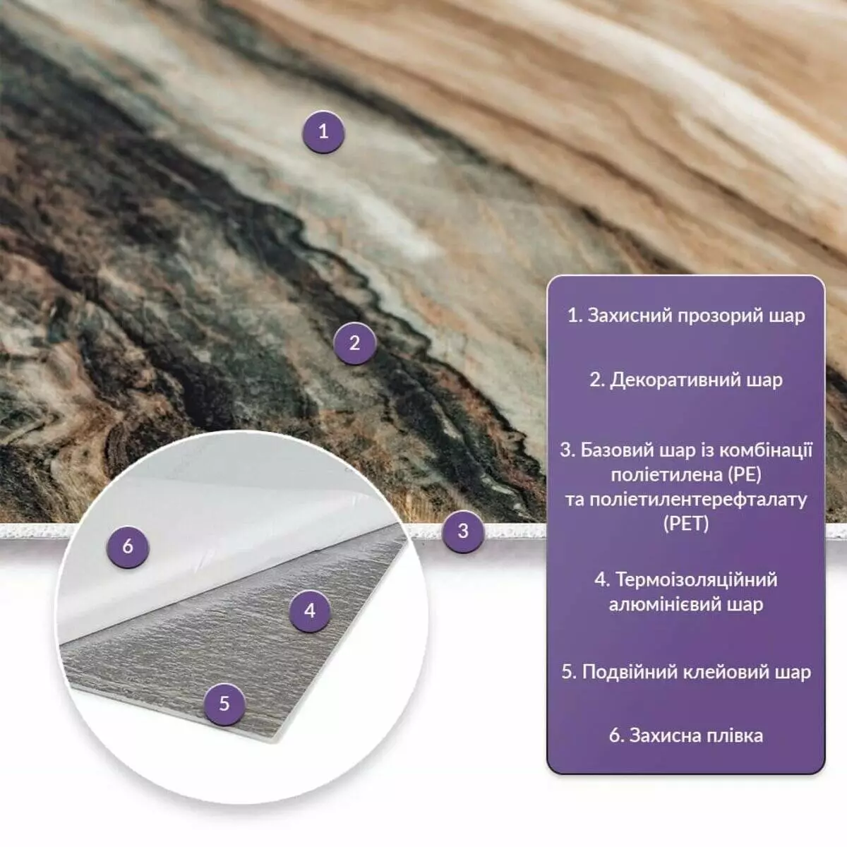 Як і в натуральних матеріалах, малюнки РЕТ плиток можуть трохи відрізнятися між собою, зберігаючи при цьому загальний дизайн та колір, що ще більше підкреслює природну імітацію. Також просимо взяти до уваги, що виробник має право змінювати зовнішній вигляд товару, зокрема відтінок та малюнок, на власний розсуд і без попереднього повідомлення.Шари матеріалу: