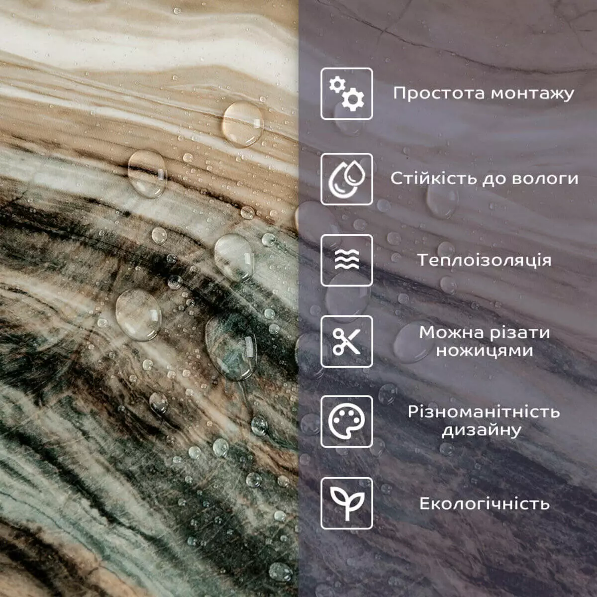 - 1. Легкість та міцність: плитка легка та міцна, що спрощує її логістику, установку та забезпечує довгий термін служби. Матеріал легкий в установці, можна різати ножицями чи монтажним ножем, не потребує додаткових матеріалів чи спеціалістів. Між смугами не розходиться, не роздмухується і не деформується. Відсоток обрізу становить 1%, що є найкращим показником для настінних покриттів;