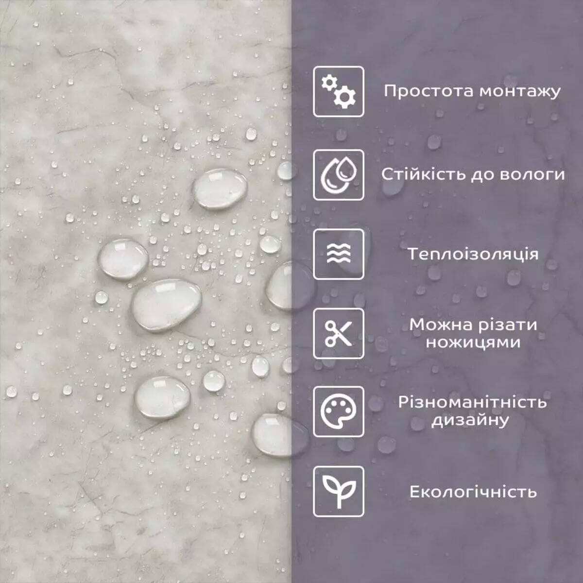 - 1. Легкість та міцність: плитка легка та міцна, що спрощує її логістику, установку та забезпечує довгий термін служби. Матеріал легкий в установці, можна різати ножицями чи монтажним ножем, не потребує додаткових матеріалів чи спеціалістів. Між смугами не розходиться, не роздмухується і не деформується. Відсоток обрізу становить 1%, що є найкращим показником для настінних покриттів;