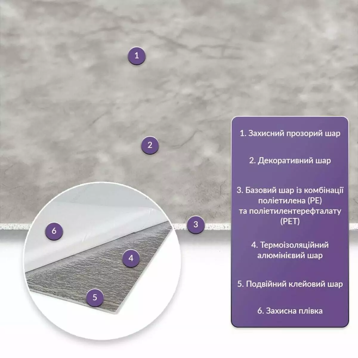 Як і в натуральних матеріалах, малюнки РЕТ плиток можуть трохи відрізнятися між собою, зберігаючи при цьому загальний дизайн та колір, що ще більше підкреслює природну імітацію. Також просимо взяти до уваги, що виробник має право змінювати зовнішній вигляд товару, зокрема відтінок та малюнок, на власний розсуд і без попереднього повідомлення.Шари матеріалу: