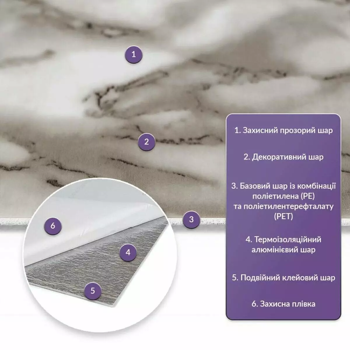 Як і в натуральних матеріалах, малюнки РЕТ плиток можуть трохи відрізнятися між собою, зберігаючи при цьому загальний дизайн та колір, що ще більше підкреслює природну імітацію. Також просимо взяти до уваги, що виробник має право змінювати зовнішній вигляд товару, зокрема відтінок та малюнок, на власний розсуд і без попереднього повідомлення.Шари матеріалу: