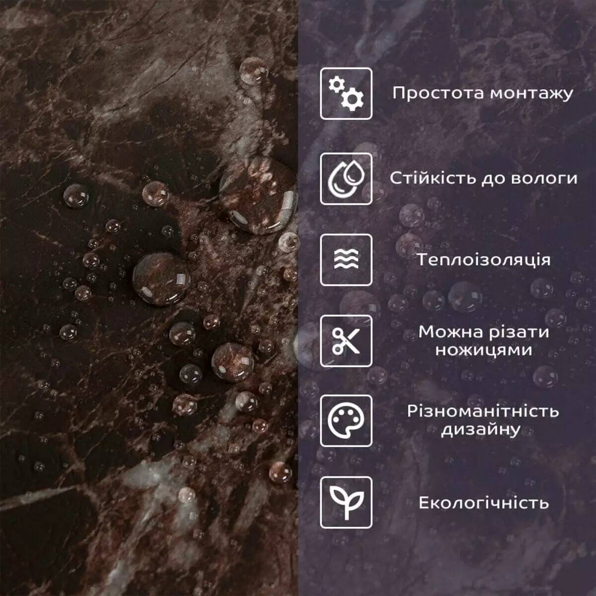 - 1. Легкість та міцність: плитка легка та міцна, що спрощує її логістику, установку та забезпечує довгий термін служби. Матеріал легкий в установці, можна різати ножицями чи монтажним ножем, не потребує додаткових матеріалів чи спеціалістів. Між смугами не розходиться, не роздмухується і не деформується. Відсоток обрізу становить 1%, що є найкращим показником для настінних покриттів;