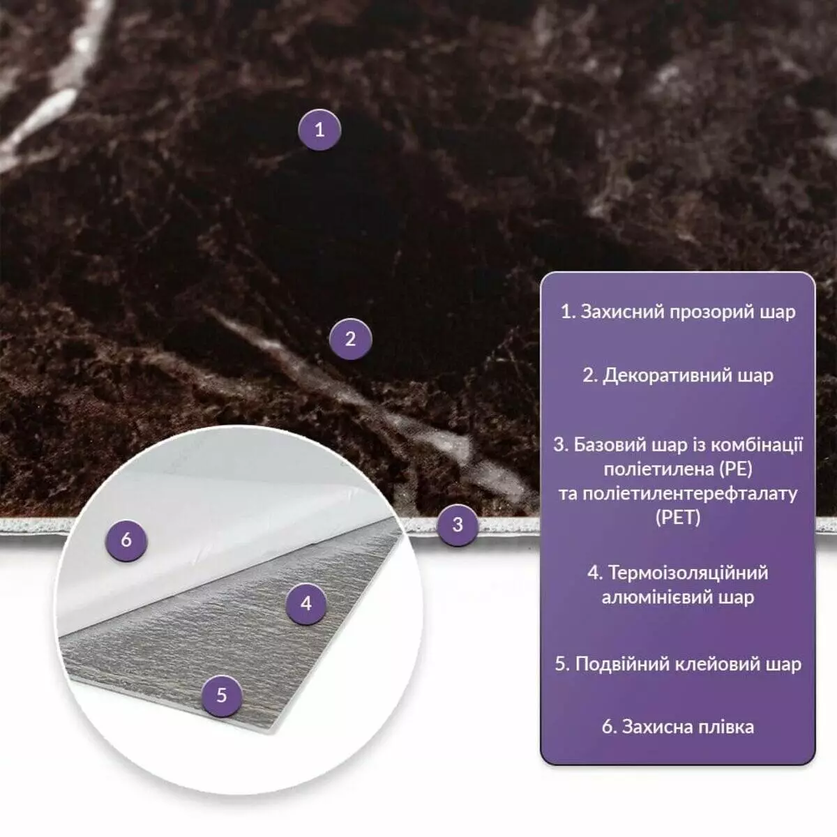 Як і в натуральних матеріалах, малюнки РЕТ плиток можуть трохи відрізнятися між собою, зберігаючи при цьому загальний дизайн та колір, що ще більше підкреслює природну імітацію. Також просимо взяти до уваги, що виробник має право змінювати зовнішній вигляд товару, зокрема відтінок та малюнок, на власний розсуд і без попереднього повідомлення.Шари матеріалу: