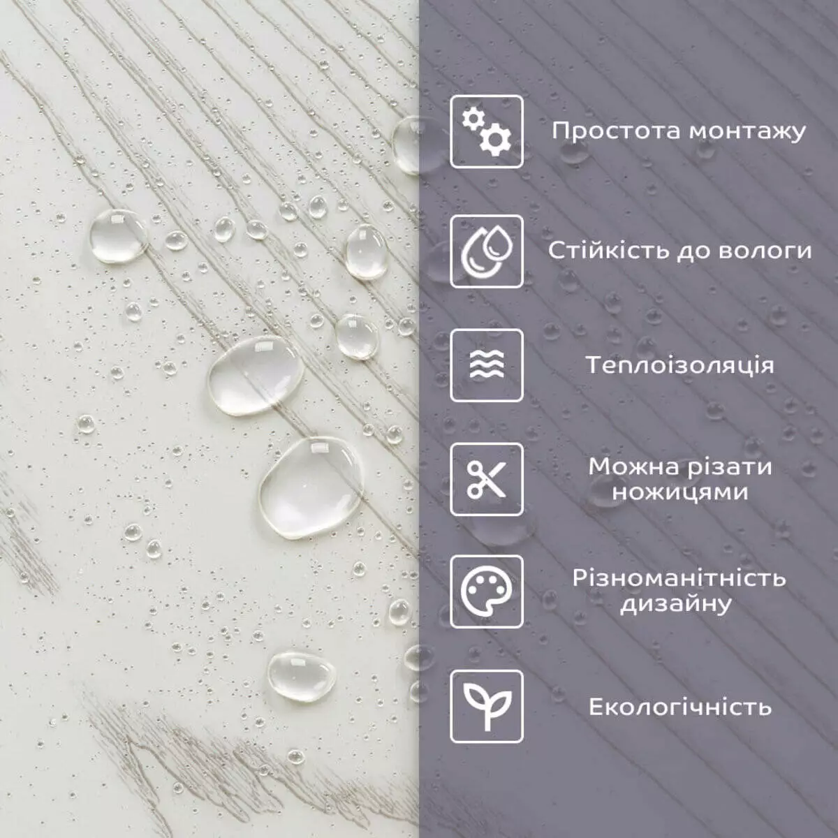 - 2. Стійкість до вологи: матеріал стійкий до впливу вологи та пари, а також до появи плісняви, що робить його придатним для використання у приміщеннях з високою вологістю, таких як ванни та кухні. Плитка підходить для створення фартуха кухні, можна клеїти біля плити на відстані не менше ніж 20-25 см;