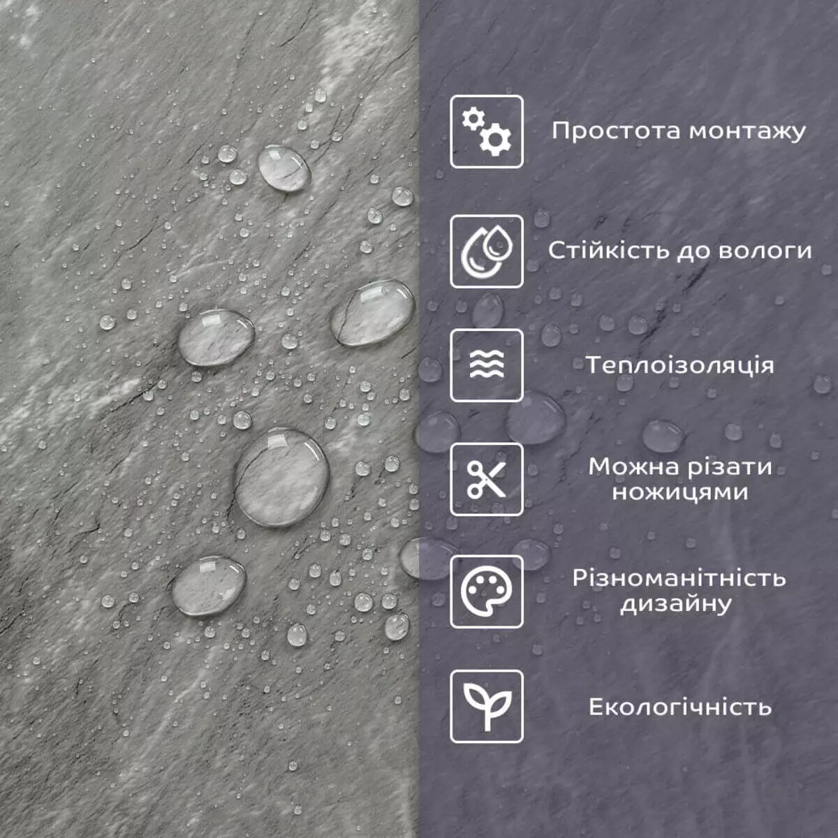 - 1. Легкість та міцність: плитка легка та міцна, що спрощує її логістику, установку та забезпечує довгий термін служби. Матеріал легкий в установці, можна різати ножицями чи монтажним ножем, не потребує додаткових матеріалів чи спеціалістів. Між смугами не розходиться, не роздмухується і не деформується. Відсоток обрізу становить 1%, що є найкращим показником для настінних покриттів;