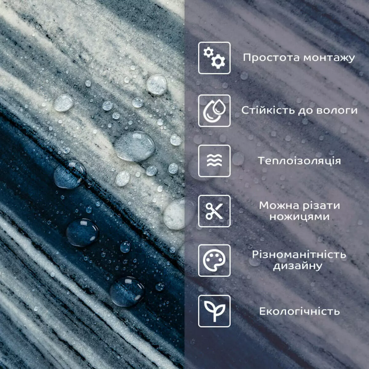 - 1. Легкість та міцність: плитка легка та міцна, що спрощує її логістику, установку та забезпечує довгий термін служби. Матеріал легкий в установці, можна різати ножицями чи монтажним ножем, не потребує додаткових матеріалів чи спеціалістів. Між смугами не розходиться, не роздмухується і не деформується. Відсоток обрізу становить 1%, що є найкращим показником для настінних покриттів;