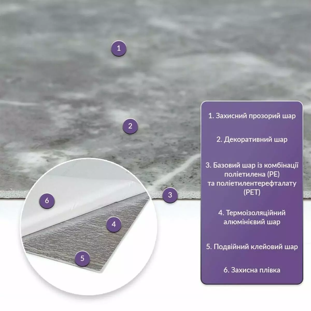 Як і в натуральних матеріалах, малюнки РЕТ плиток можуть трохи відрізнятися між собою, зберігаючи при цьому загальний дизайн та колір, що ще більше підкреслює природну імітацію. Також просимо взяти до уваги, що виробник має право змінювати зовнішній вигляд товару, зокрема відтінок та малюнок, на власний розсуд і без попереднього повідомлення.Шари матеріалу: