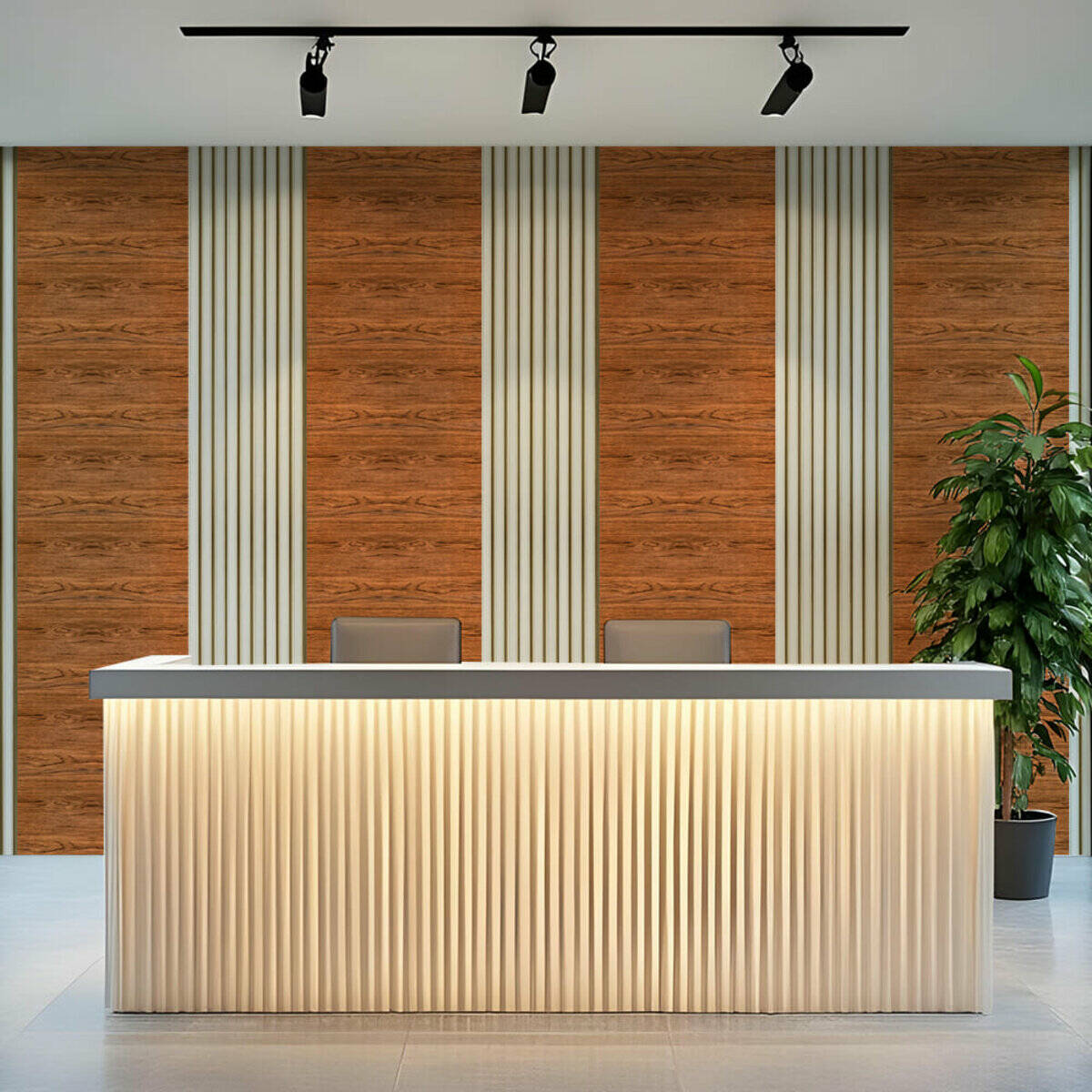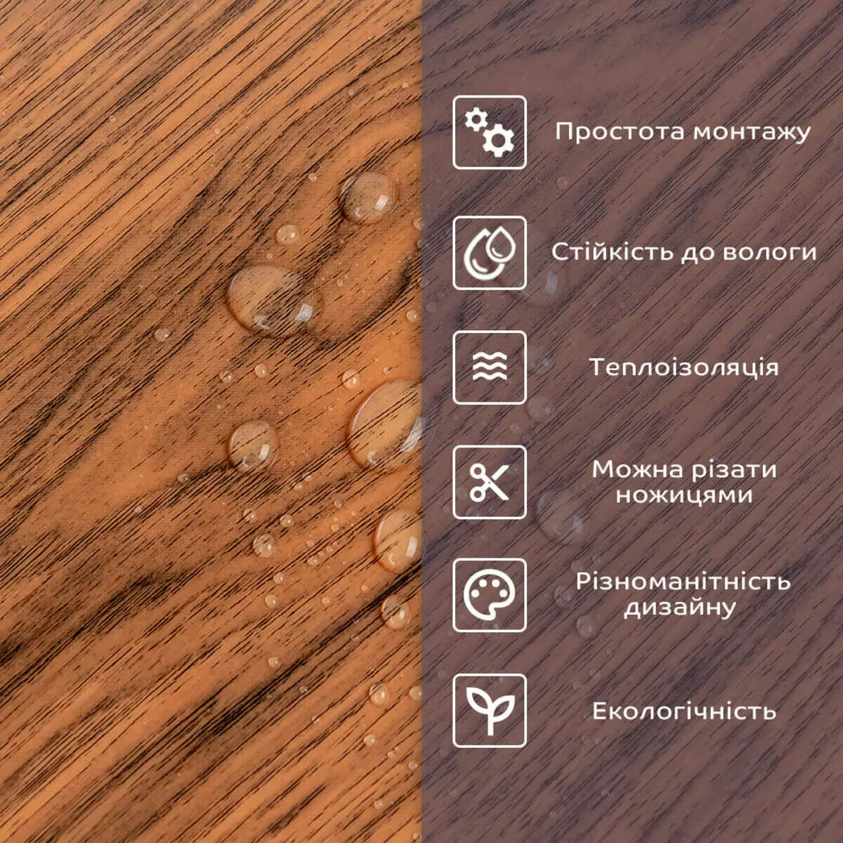 - 1. Легкість та міцність: плитка легка та міцна, що спрощує її логістику, установку та забезпечує довгий термін служби. Матеріал легкий в установці, можна різати ножицями чи монтажним ножем, не потребує додаткових матеріалів чи спеціалістів. Між смугами не розходиться, не роздмухується і не деформується. Відсоток обрізу становить 1%, що є найкращим показником для настінних покриттів;