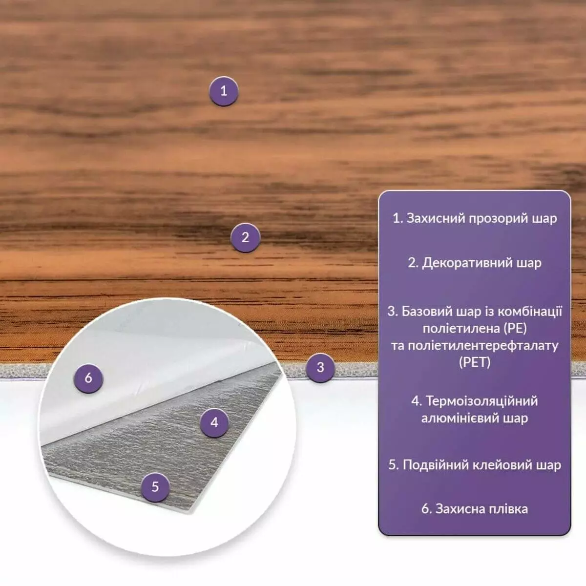 Як і в натуральних матеріалах, малюнки РЕТ плиток можуть трохи відрізнятися між собою, зберігаючи при цьому загальний дизайн та колір, що ще більше підкреслює природну імітацію. Також просимо взяти до уваги, що виробник має право змінювати зовнішній вигляд товару, зокрема відтінок та малюнок, на власний розсуд і без попереднього повідомлення.Шари матеріалу: