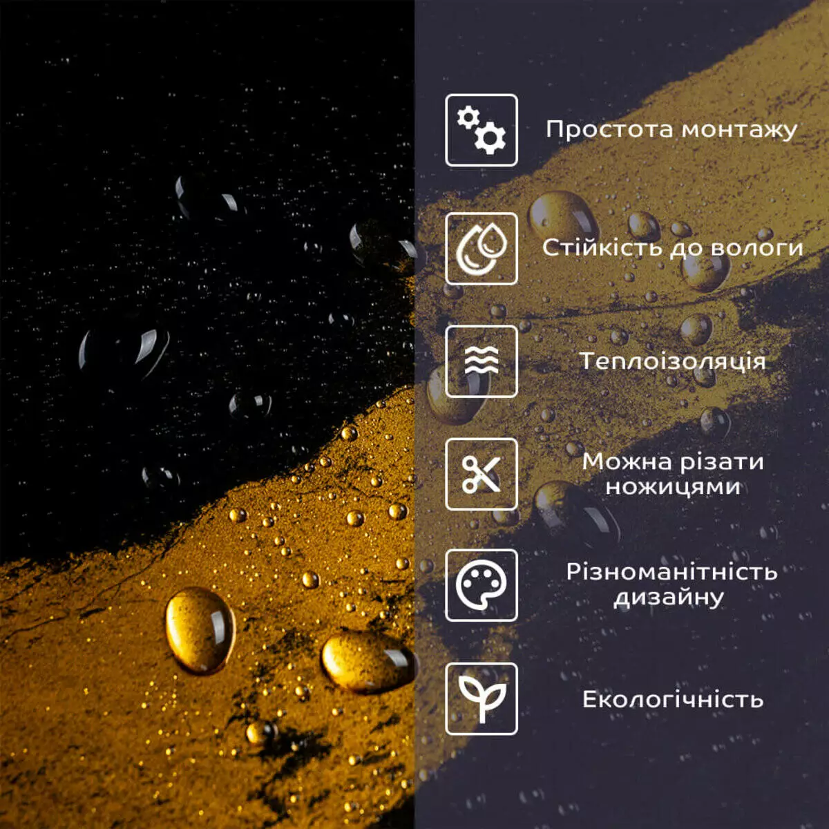 - 1. Легкість та міцність: плитка легка та міцна, що спрощує її логістику, установку та забезпечує довгий термін служби. Матеріал легкий в установці, можна різати ножицями чи монтажним ножем, не потребує додаткових матеріалів чи спеціалістів. Між смугами не розходиться, не роздмухується і не деформується. Відсоток обрізу становить 1%, що є найкращим показником для настінних покриттів;