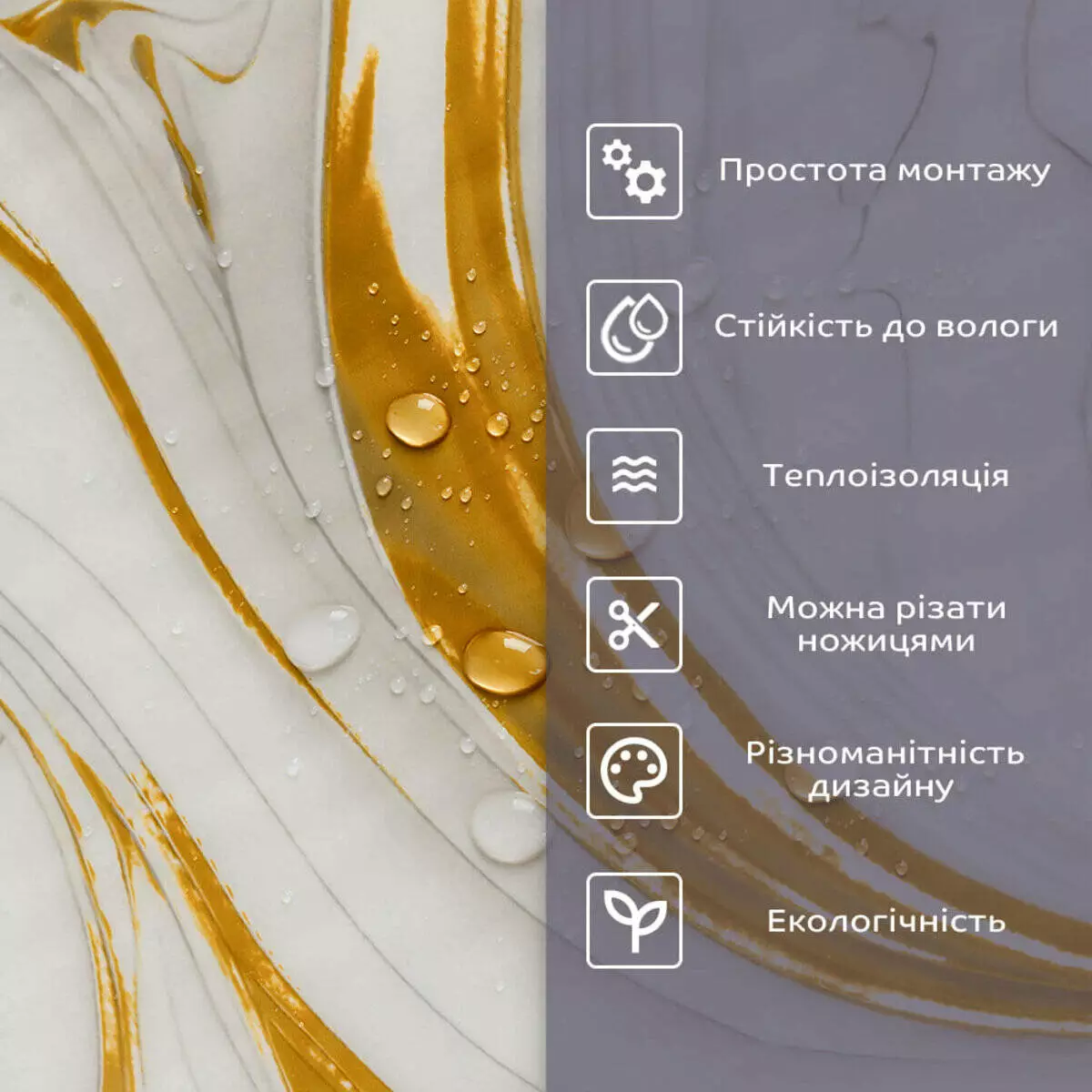 - 1. Легкість та міцність: плитка легка та міцна, що спрощує її логістику, установку та забезпечує довгий термін служби. Матеріал легкий в установці, можна різати ножицями чи монтажним ножем, не потребує додаткових матеріалів чи спеціалістів. Між смугами не розходиться, не роздмухується і не деформується. Відсоток обрізу становить 1%, що є найкращим показником для настінних покриттів;