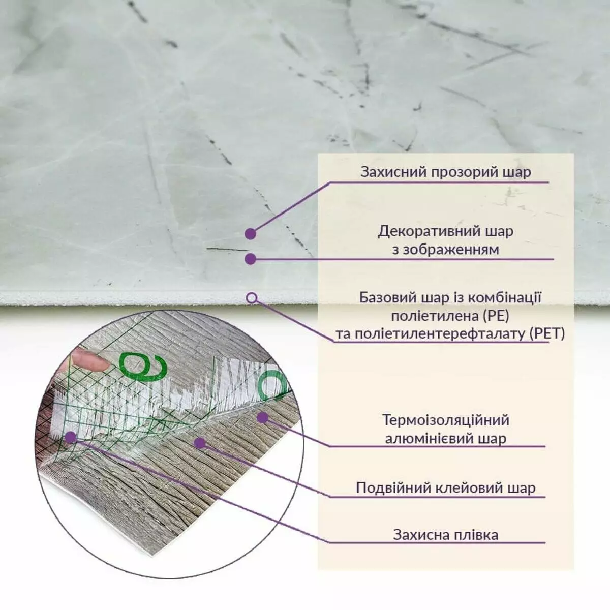 Матеріал: PE+PET, складається з суміші двох полімерів: поліетилену (PE) та поліетилентерефталату (PET)