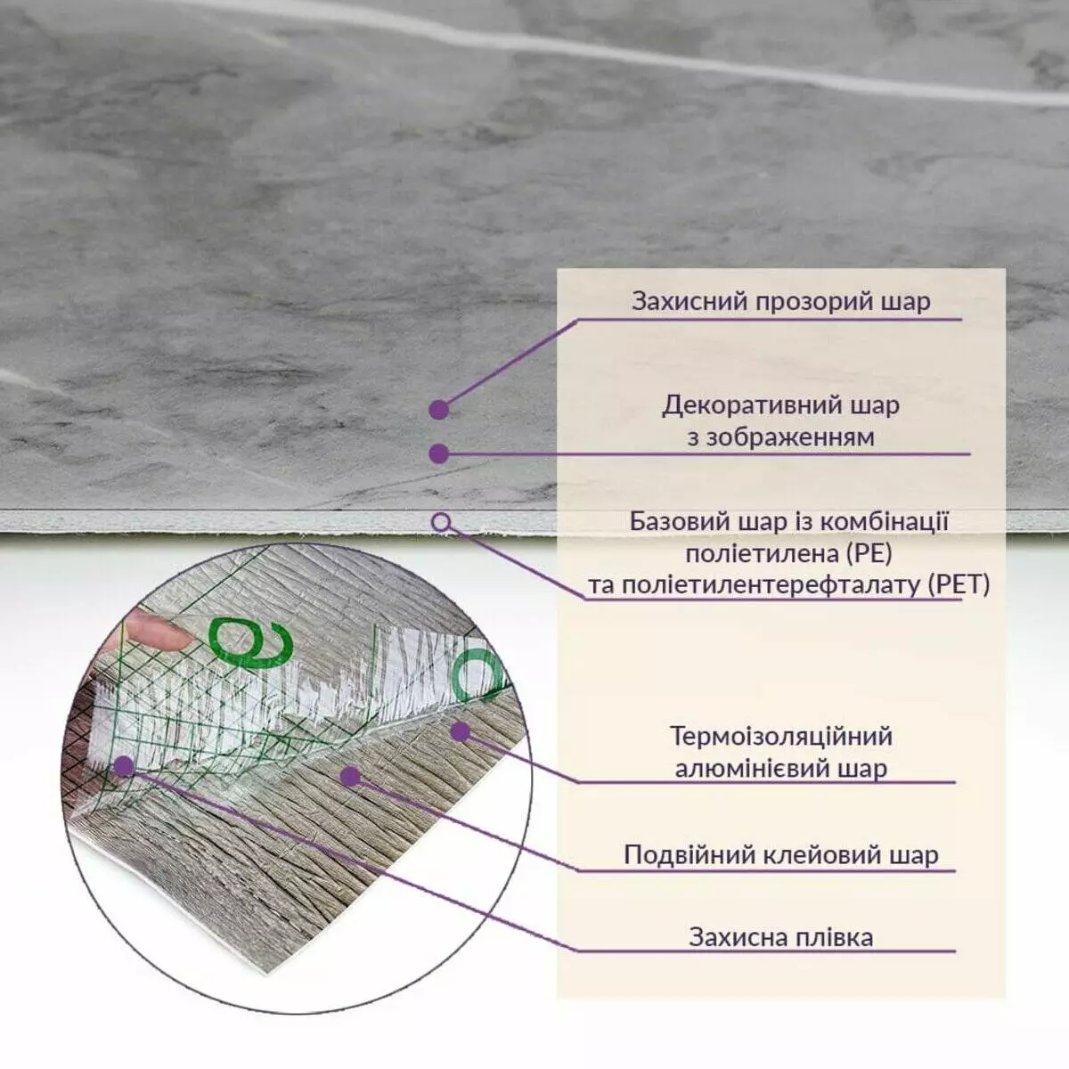 Матеріал: PE+PET, складається з суміші двох полімерів: поліетилену (PE) та поліетилентерефталату (PET)