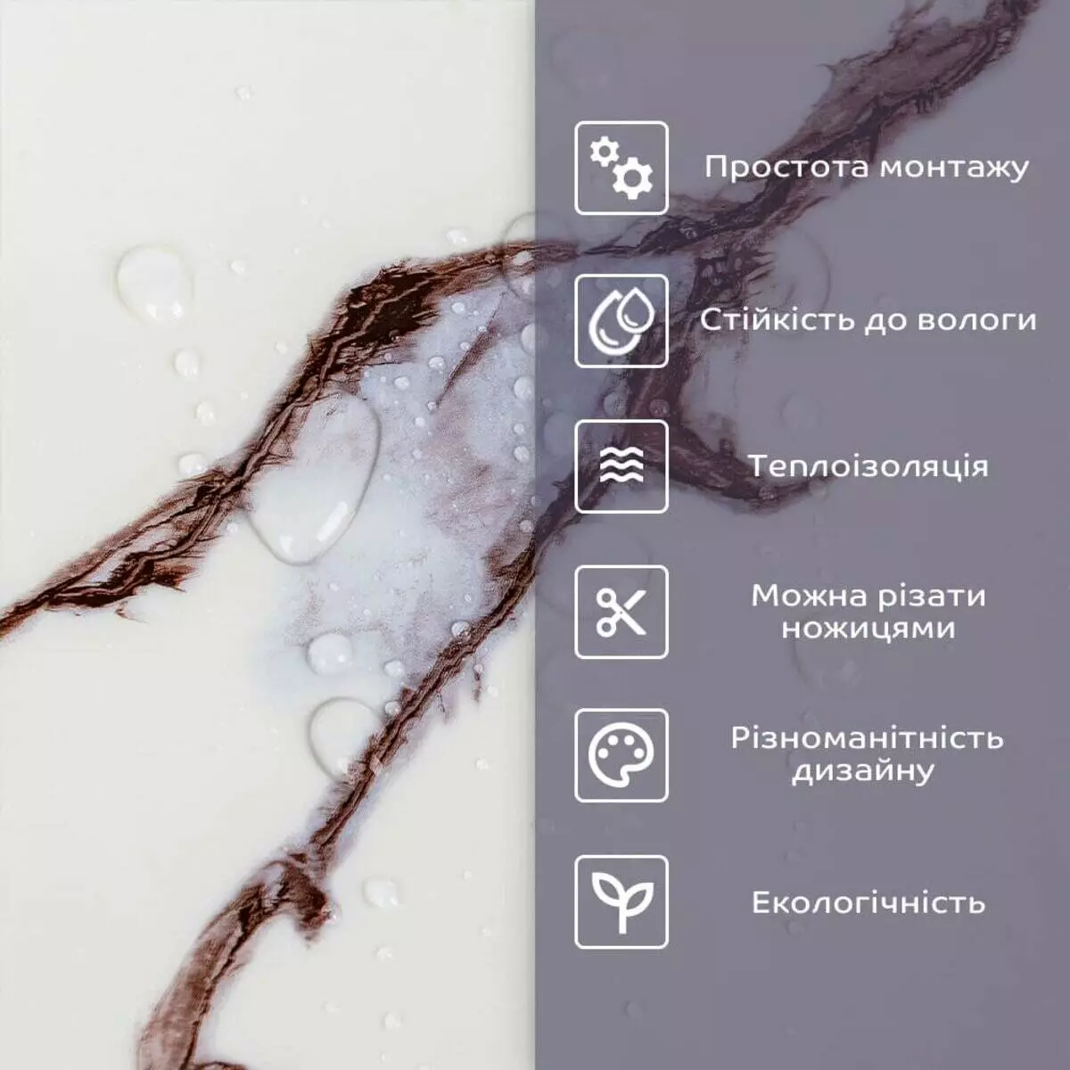 - 1. Легкість та міцність: плитка легка та міцна, що спрощує її логістику, установку та забезпечує довгий термін служби. Матеріал легкий в установці, можна різати ножицями чи монтажним ножем, не потребує додаткових матеріалів чи спеціалістів. Між смугами не розходиться, не роздмухується і не деформується. Відсоток обрізу становить 1%, що є найкращим показником для настінних покриттів;