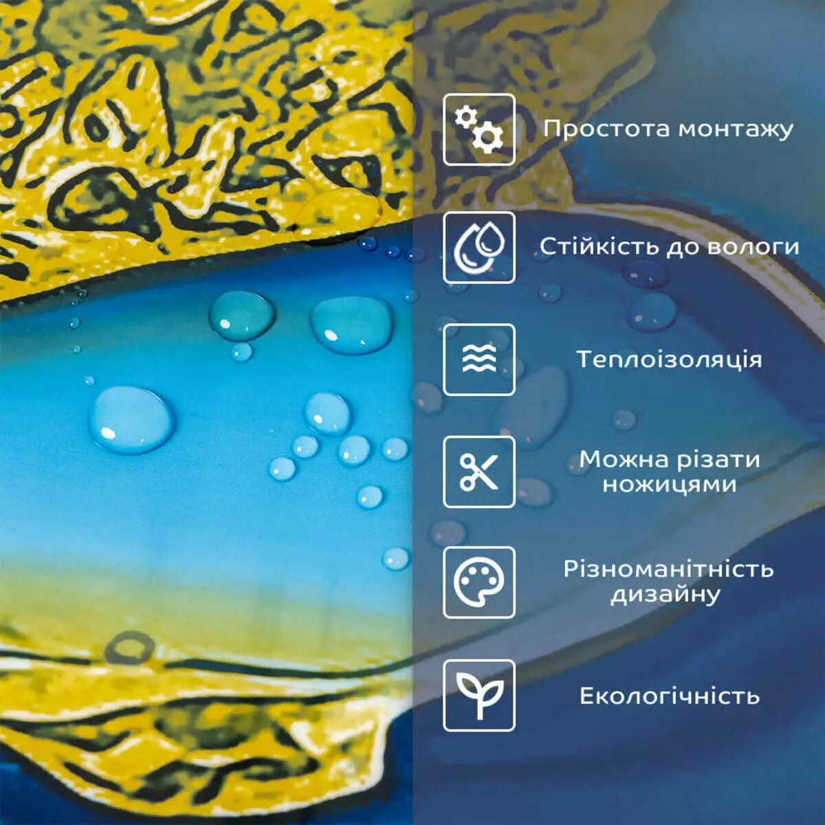 - 1. Легкість та міцність: плитка легка та міцна, що спрощує її логістику, установку та забезпечує довгий термін служби. Матеріал легкий в установці, можна різати ножицями чи монтажним ножем, не потребує додаткових матеріалів чи спеціалістів. Між смугами не розходиться, не роздмухується і не деформується. Відсоток обрізу становить 1%, що є найкращим показником для настінних покриттів;