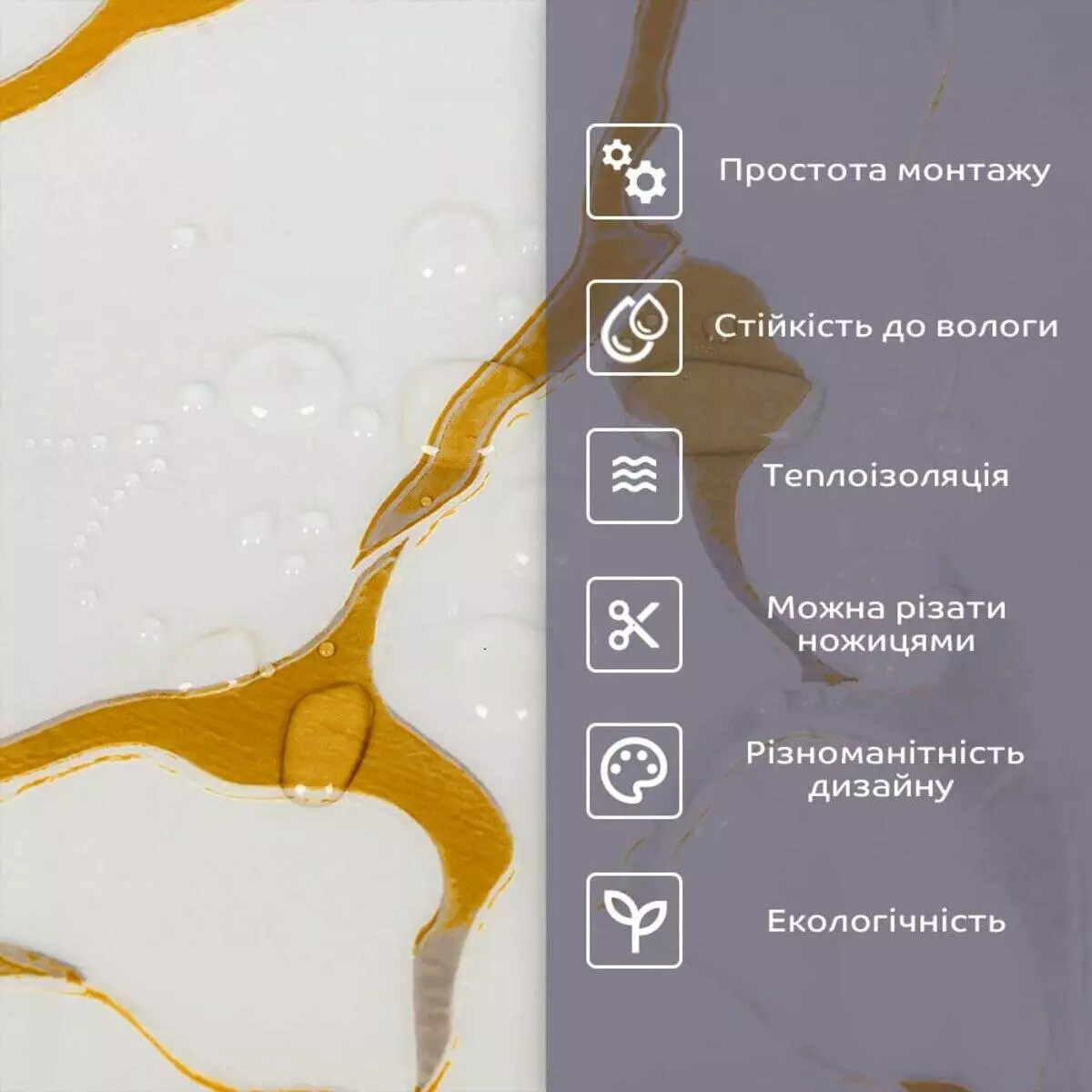 - 1. Легкість та міцність: плитка легка та міцна, що спрощує її логістику, установку та забезпечує довгий термін служби. Матеріал легкий в установці, можна різати ножицями чи монтажним ножем, не потребує додаткових матеріалів чи спеціалістів. Між смугами не розходиться, не роздмухується і не деформується. Відсоток обрізу становить 1%, що є найкращим показником для настінних покриттів;