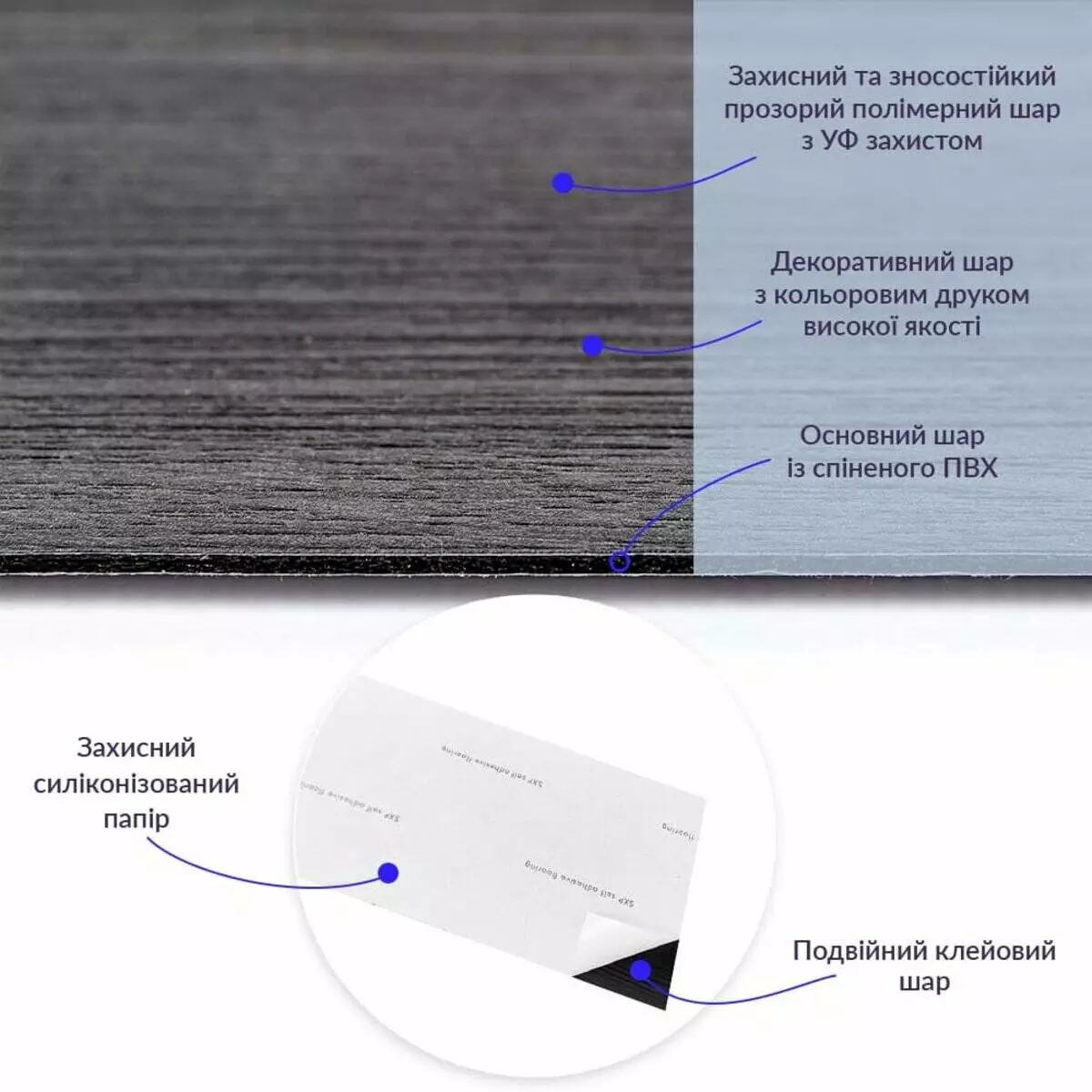 • Декоративний шар: плівка з кольоровим друком високої якості, яка повністю імітує фактуру природних матеріалів завдяки чіткому та деталізованому зображенню.