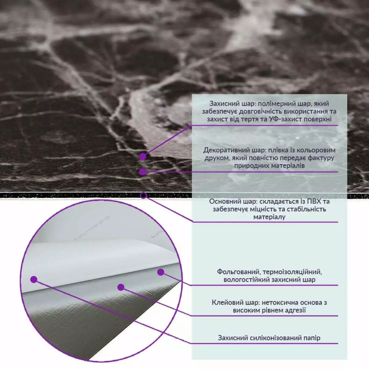 - Декоративний шар: плівка з кольоровим друком високої якості, яка повністю імітує фактуру природних матеріалів завдяки чіткому та деталізованому зображенню.
