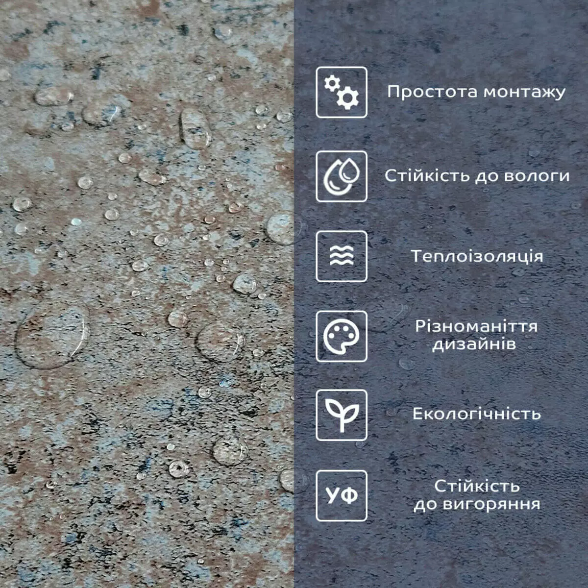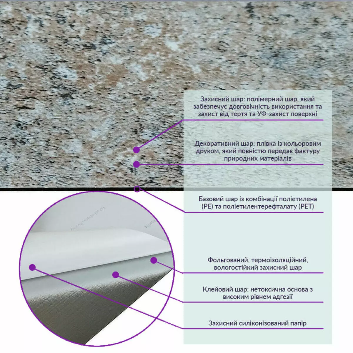 - Полімерний шар: захищає від потертостей та дрібних механічних пошкоджень, забезпечує довговічність використання, а УФ захист допомагає запобігти вигоранню, зберігаючи колір насиченим.