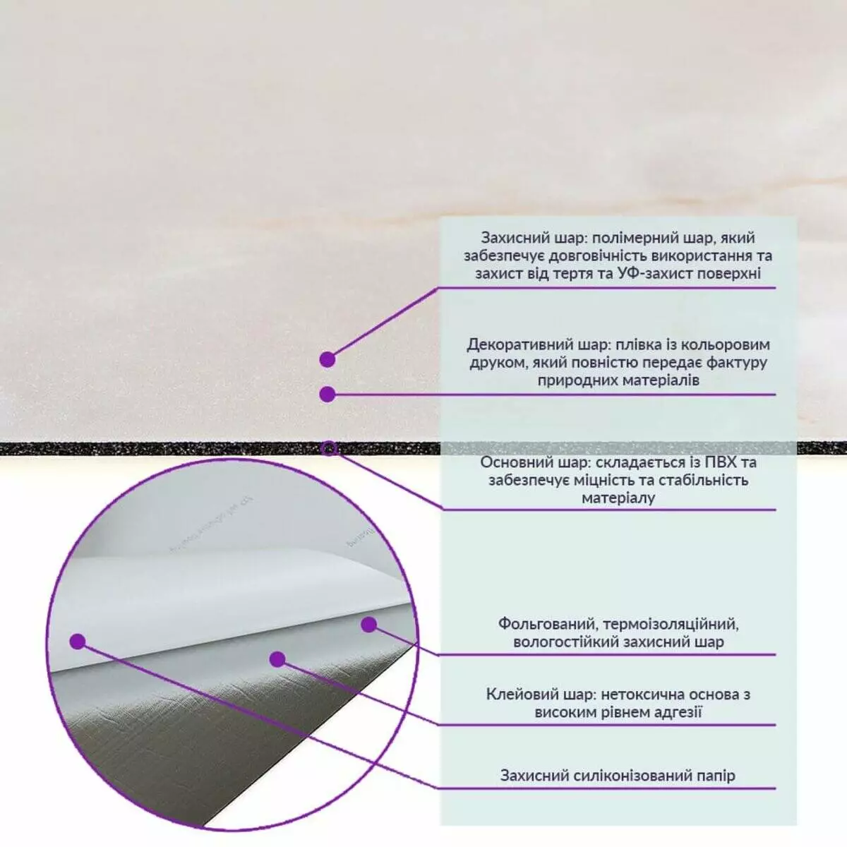 - Полімерний шар: захищає від потертостей та дрібних механічних пошкоджень, забезпечує довговічність використання, а УФ захист допомагає запобігти вигоранню, зберігаючи колір насиченим.